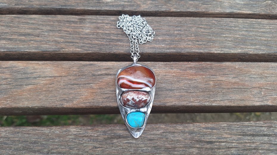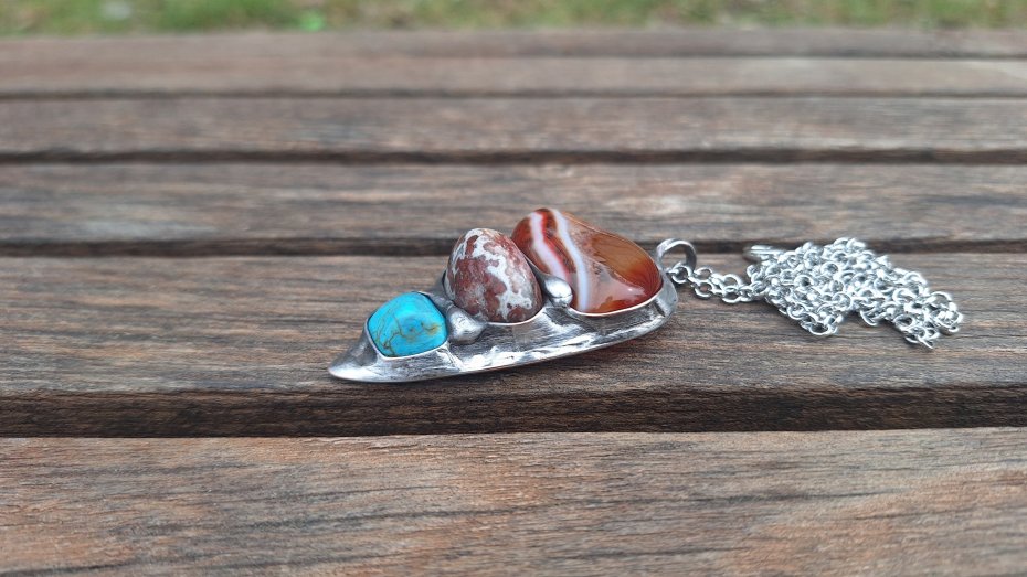 Wisiorek wykonany z miedzi, cyny, howlitu i agatów. Wymiary ok. 6 na 3 cm. Zawieszony na łańcuszku o długości ok. 50 cm.