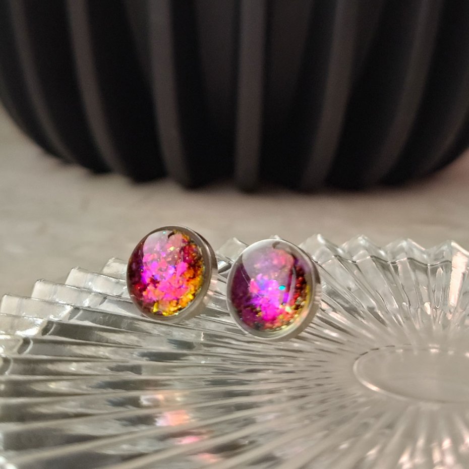 Eleganckie kolczyki sztyfty wykonane z wysokiej jakości stali szlachetnej, wypełnione mieniącym się pyłkiem zatopionym w żywicy, który pięknie odbija światło i dodaje biżuterii subtelnego blasku. Każda para jest ręcznie robiona, dzięki czemu kolczyki są unikalne i dopracowane w najdrobniejszych detalach. Minimalistyczna forma sprawia, że doskonale sprawdzą się zarówno na co dzień, jak i jako elegancki akcent do wyjątkowych stylizacji. Trwałe materiały i staranne wykonanie czynią je idealnym wyborem dla osób ceniących oryginalną biżuterię handmade oraz ponadczasowy design.