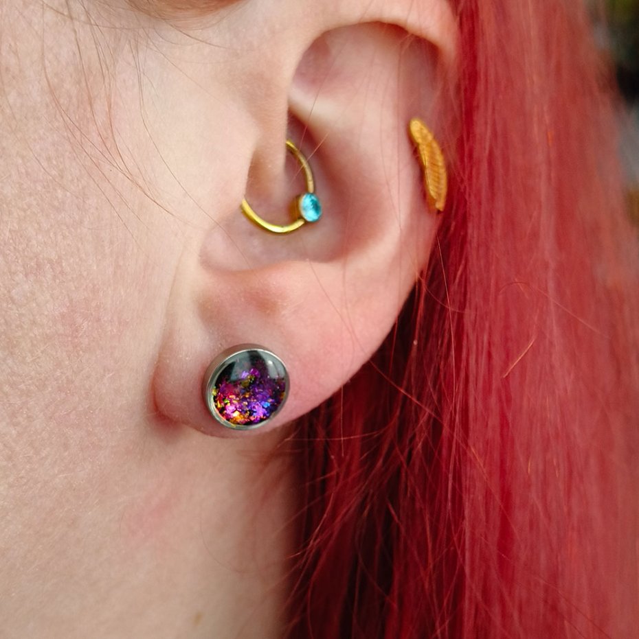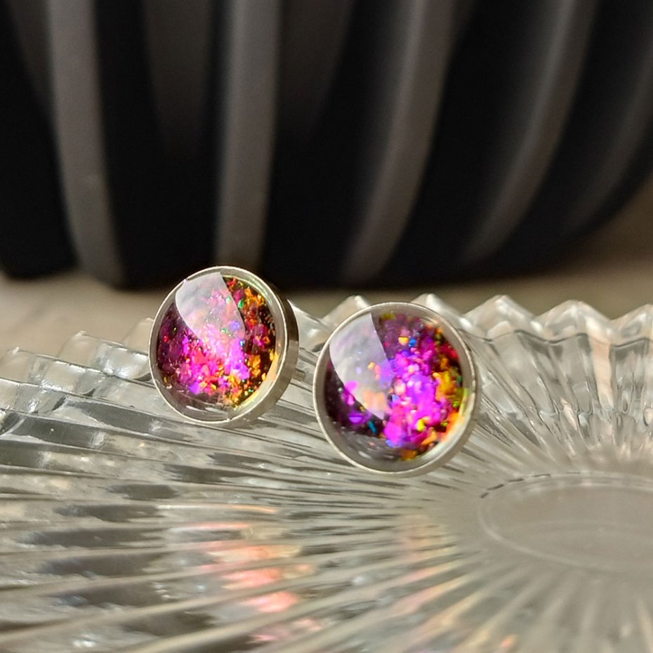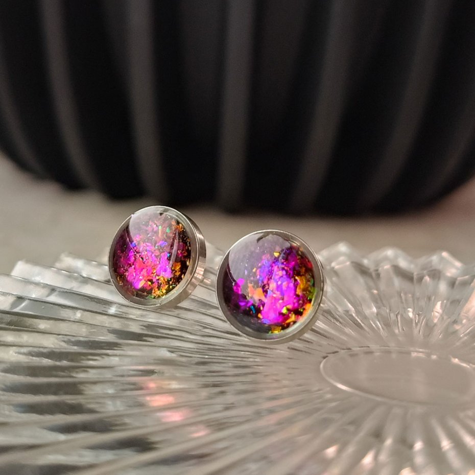 Eleganckie kolczyki sztyfty wykonane z wysokiej jakości stali szlachetnej, wypełnione mieniącym się pyłkiem zatopionym w żywicy, który pięknie odbija światło i dodaje biżuterii subtelnego blasku. Każda para jest ręcznie robiona, dzięki czemu kolczyki są unikalne i dopracowane w najdrobniejszych detalach. Minimalistyczna forma sprawia, że doskonale sprawdzą się zarówno na co dzień, jak i jako elegancki akcent do wyjątkowych stylizacji. Trwałe materiały i staranne wykonanie czynią je idealnym wyborem dla osób ceniących oryginalną biżuterię handmade oraz ponadczasowy design.