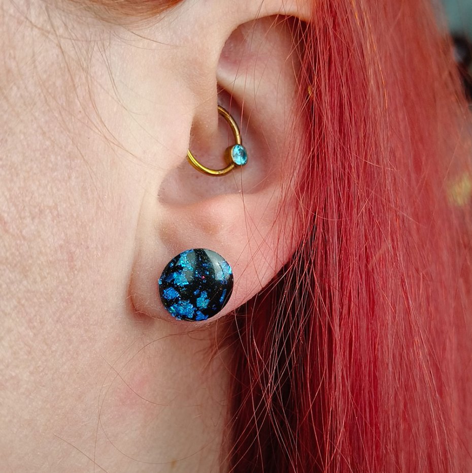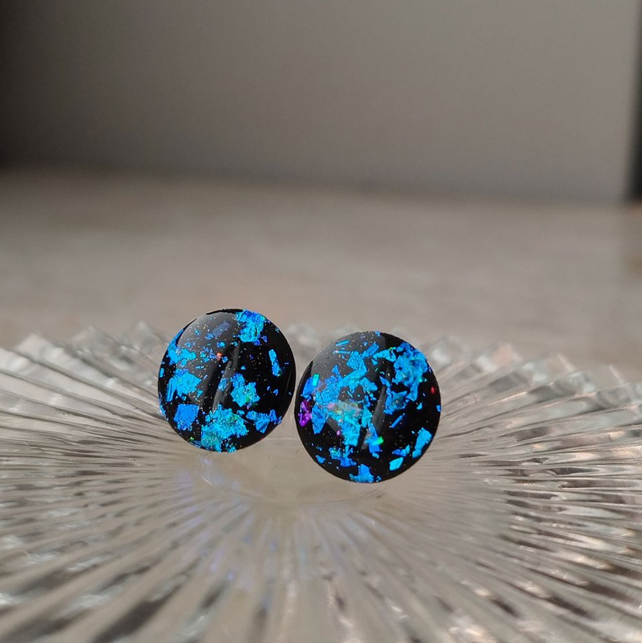 Eleganckie kolczyki sztyfty wykonane z wysokiej jakości stali szlachetnej, wypełnione mieniącym się pyłkiem zatopionym w żywicy, który pięknie odbija światło i dodaje biżuterii subtelnego blasku. Każda para jest ręcznie robiona, dzięki czemu kolczyki są unikalne i dopracowane w najdrobniejszych detalach. Minimalistyczna forma sprawia, że doskonale sprawdzą się zarówno na co dzień, jak i jako elegancki akcent do wyjątkowych stylizacji. Trwałe materiały i staranne wykonanie czynią je idealnym wyborem dla osób ceniących oryginalną biżuterię handmade oraz ponadczasowy design.