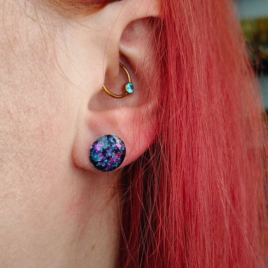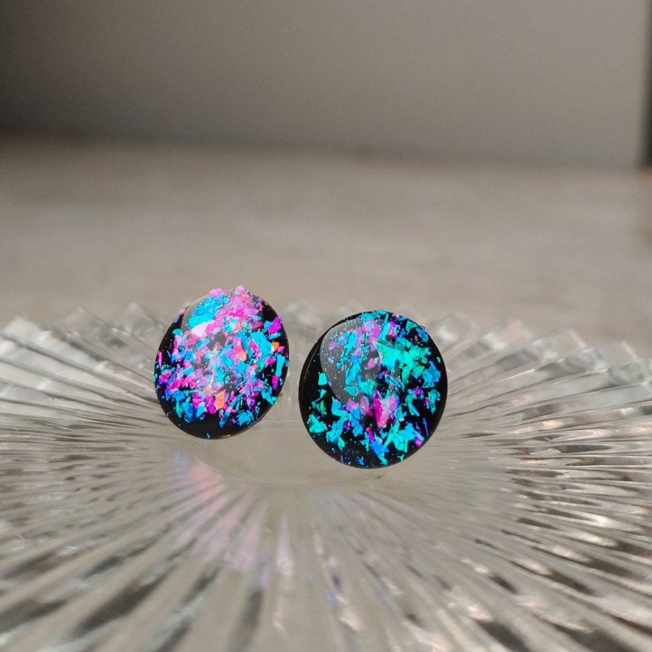 Eleganckie kolczyki sztyfty wykonane z wysokiej jakości stali szlachetnej, wypełnione mieniącym się pyłkiem zatopionym w żywicy, który pięknie odbija światło i dodaje biżuterii subtelnego blasku. Każda para jest ręcznie robiona, dzięki czemu kolczyki są unikalne i dopracowane w najdrobniejszych detalach. Minimalistyczna forma sprawia, że doskonale sprawdzą się zarówno na co dzień, jak i jako elegancki akcent do wyjątkowych stylizacji. Trwałe materiały i staranne wykonanie czynią je idealnym wyborem dla osób ceniących oryginalną biżuterię handmade oraz ponadczasowy design.
