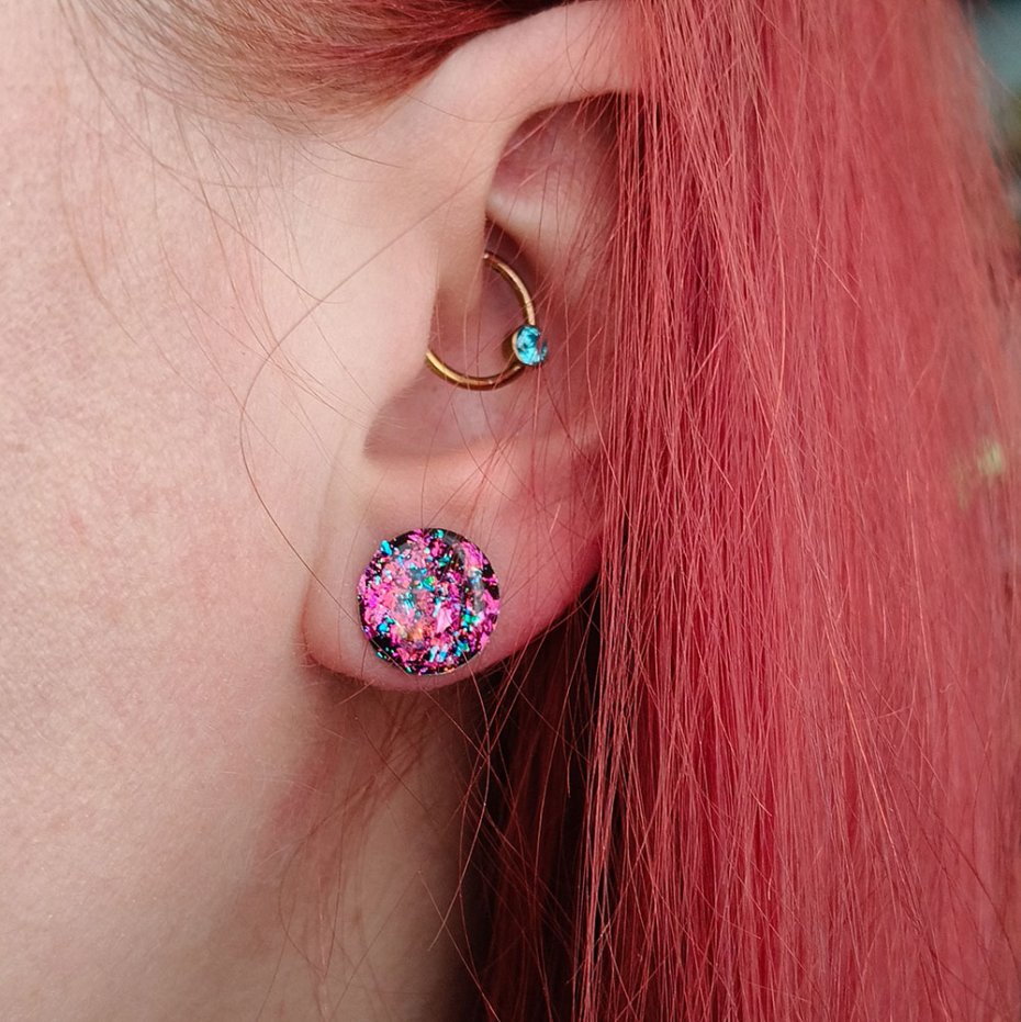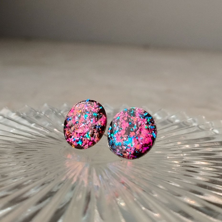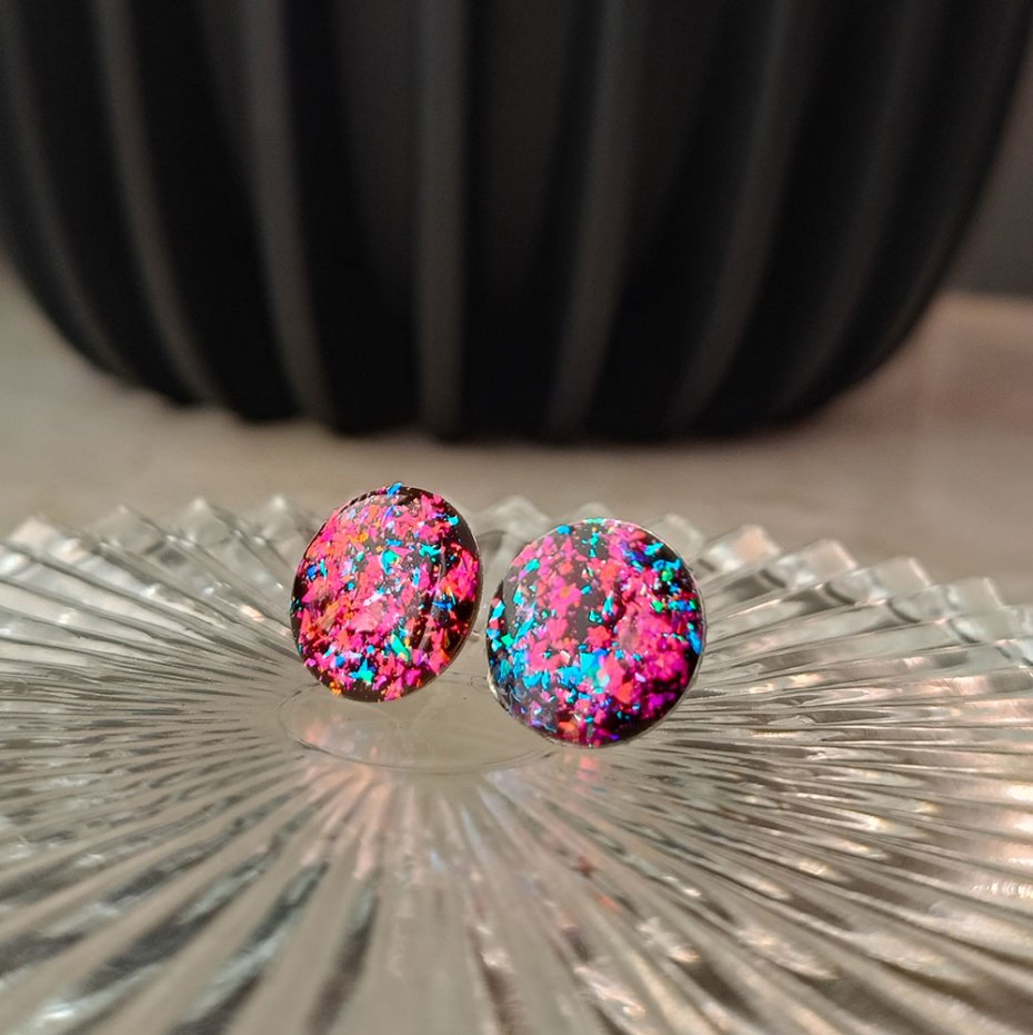 Eleganckie kolczyki sztyfty wykonane z wysokiej jakości stali szlachetnej, wypełnione mieniącym się pyłkiem zatopionym w żywicy, który pięknie odbija światło i dodaje biżuterii subtelnego blasku. Każda para jest ręcznie robiona, dzięki czemu kolczyki są unikalne i dopracowane w najdrobniejszych detalach. Minimalistyczna forma sprawia, że doskonale sprawdzą się zarówno na co dzień, jak i jako elegancki akcent do wyjątkowych stylizacji. Trwałe materiały i staranne wykonanie czynią je idealnym wyborem dla osób ceniących oryginalną biżuterię handmade oraz ponadczasowy design.