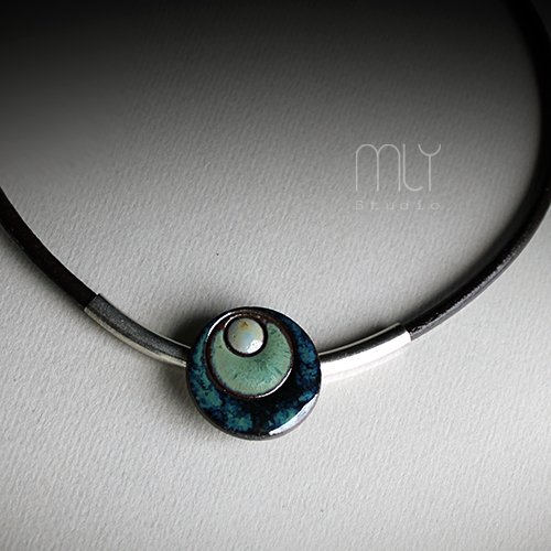 Efektowny ceramiczny wisior, ręcznie wykonany z mocno spieczonej czekoladowobrązowej gliny kamionkowej, jednostronnie szkliwiony mieszanką błękitnych i zielonych szkliw z efektem plamek , tył surowy,ciemnobrązowy, zawieszony na grubym rzemieniu jubilerskim z zapięciem w kolorze srebrnym. Średnica elementu ceramicznego około 27mm, obwód linki ok 44cm (plus 10cm łańcuszka regulacyjnego). Polecam. Termin realizacji zamówienia to 1-2 dni.