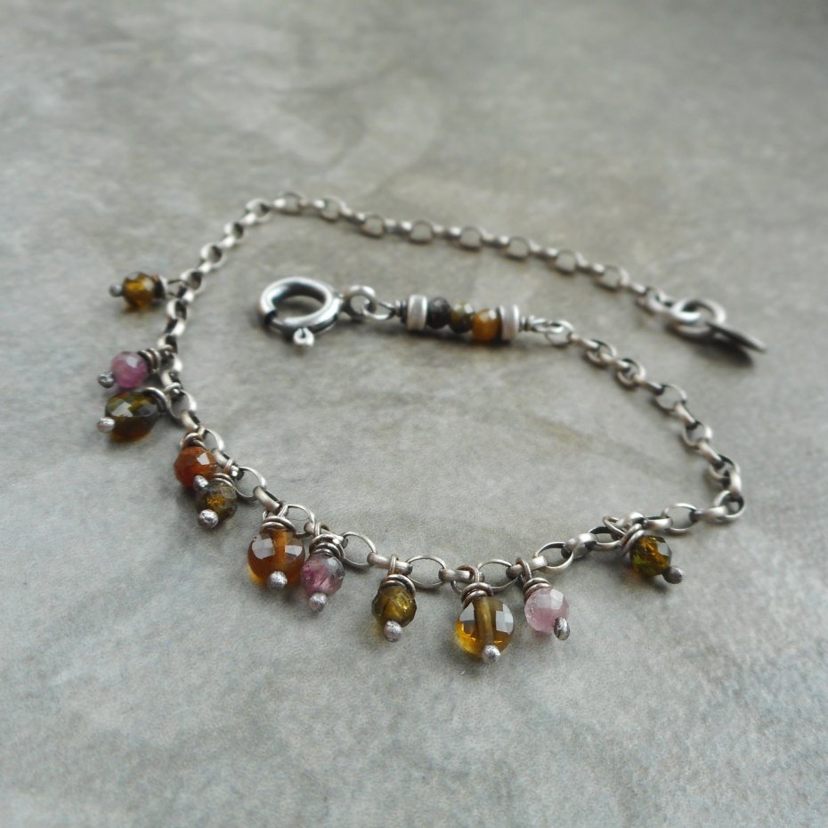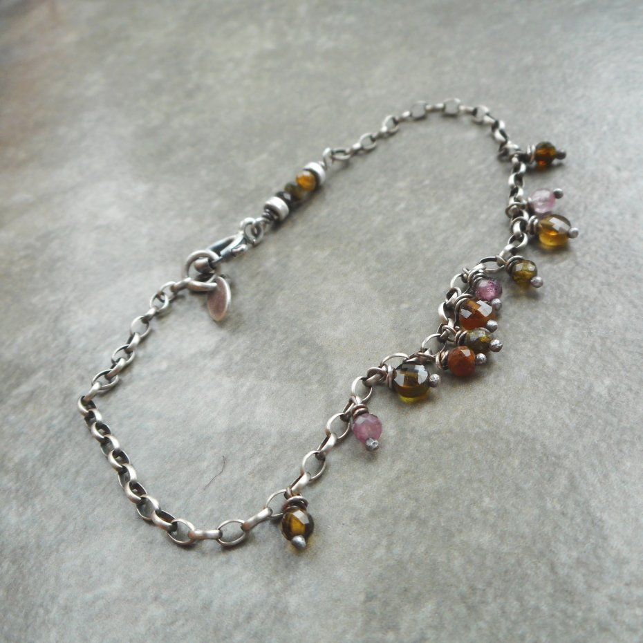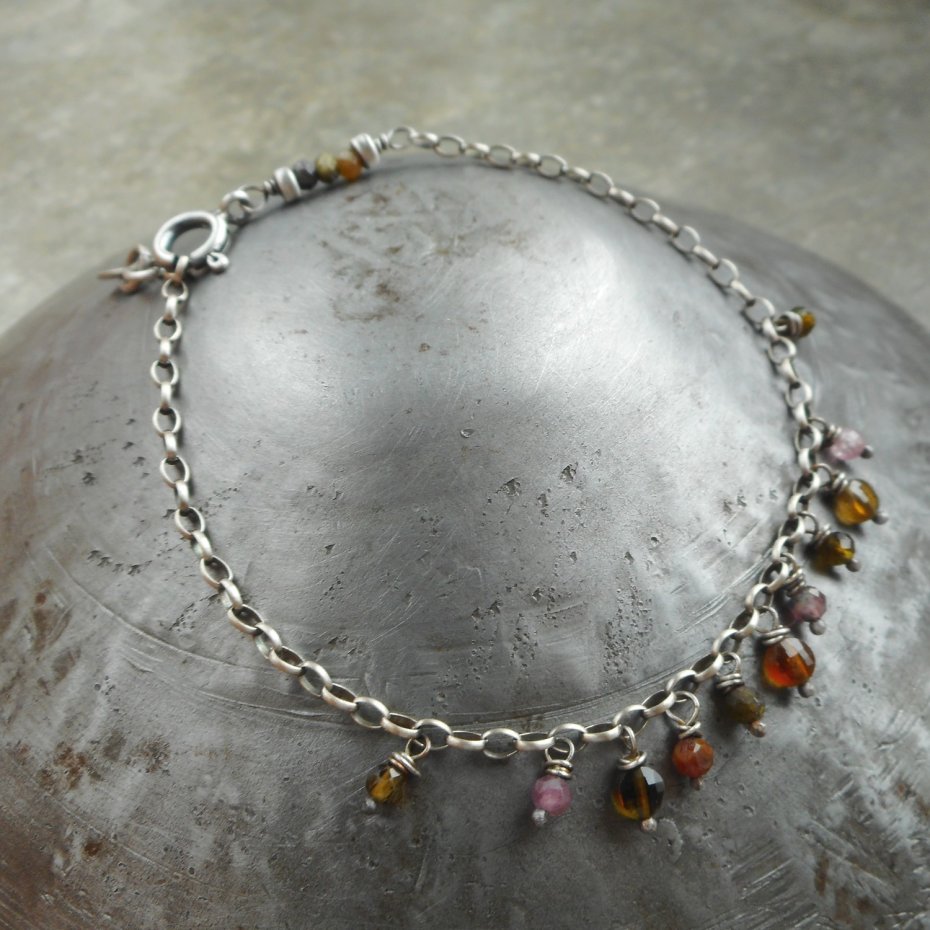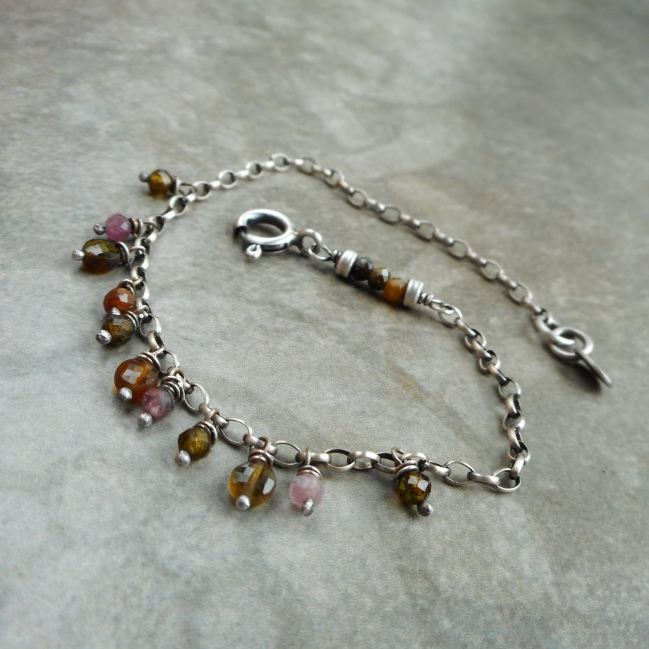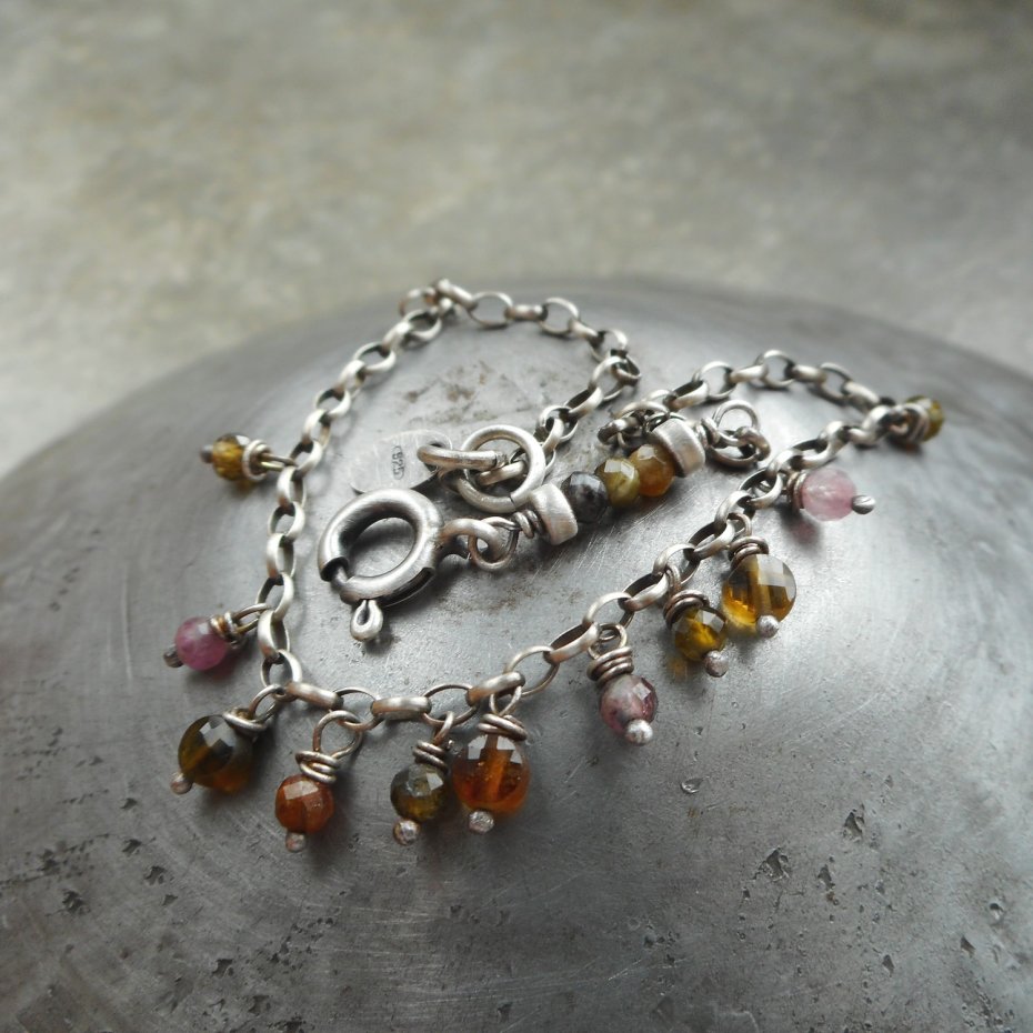 Delikatna bransoletka z zawieszkami, wykonana z kamieni naturalnych i szlachetnego srebra; lekka, łańcuszkowa, ozdobionych szeregiem drobnych, różnorodnych turmalinów.