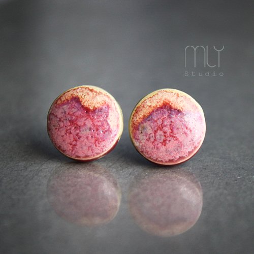 Okrągłe, lekko nieregularne ceramiczne kolczyki w formie sztyftów, ręcznie wykonane z delikatnej gliny kamionkowej, jednostronnie szkliwione mieszanką różowych szkliw z efektem plamek i subtelnym połyskiem, na antyalergicznych sztyftach w kolorze srebrnym. Średnica ok. 11mm.Polecam