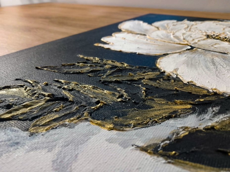 -Detale: Wyraźna, trójwymiarowa faktura zmieniająca się w zależności od kąta padania światła, zamalowane boki pozwalają na powieszenie obrazów bez konieczności oprawiania w dodatkowe ramy