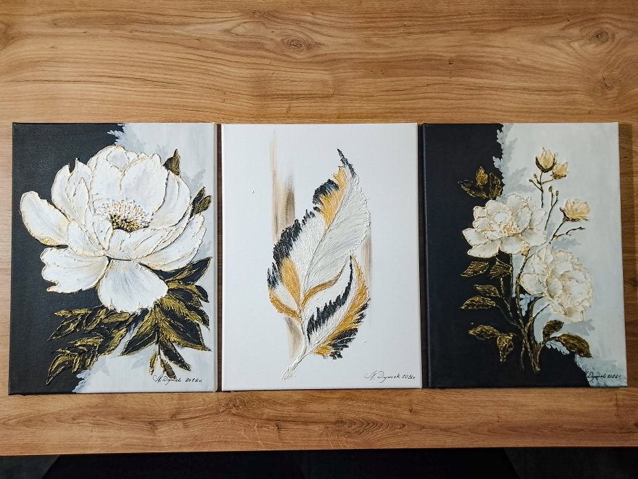 Ręcznie malowany tryptyk, który łączy w sobie delikatność natury z odważnym, nowoczesnym stylem. Centralny motyw pióra, flankowany przez rozkwitające piwonie, tworzy harmonijną opowieść o lekkości i sile. Przepięknie przenikają się biel i czerń jeszcze bardziej kontrastując i wyciągając "głębię" obrazów.