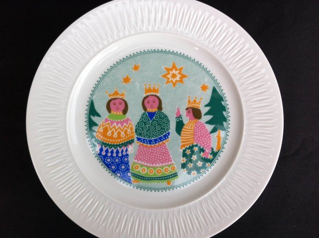 Duży porcelanowy talerz sygnowany jakością Hutschenreuther, szlachetnie dźwięczący. Piękne listkowe ryflowanie ozdobne na brzegu i ciekawe barwne zdobienie w stylu sztuki naiwnej. 25,5 x 3 cm. Stan zachowania bardzo dobry.