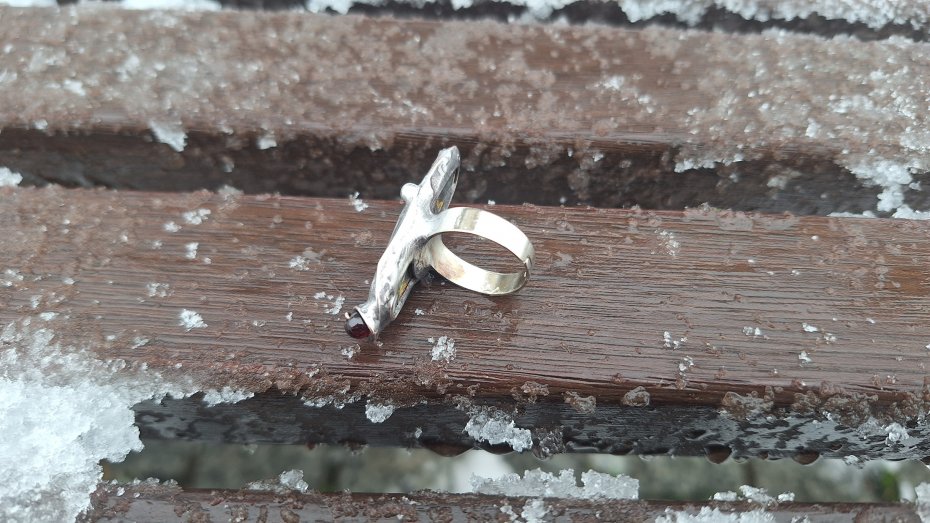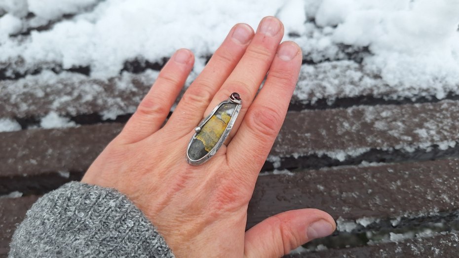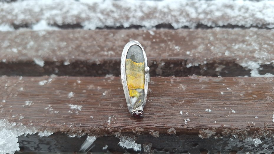 Pierścionek wykonany z miedzi, cyny, granatu i jaspisu bumble bee. Wymiary ok. 3.8 na 1.2 cm. Regulowany. Nie jest ciężki.