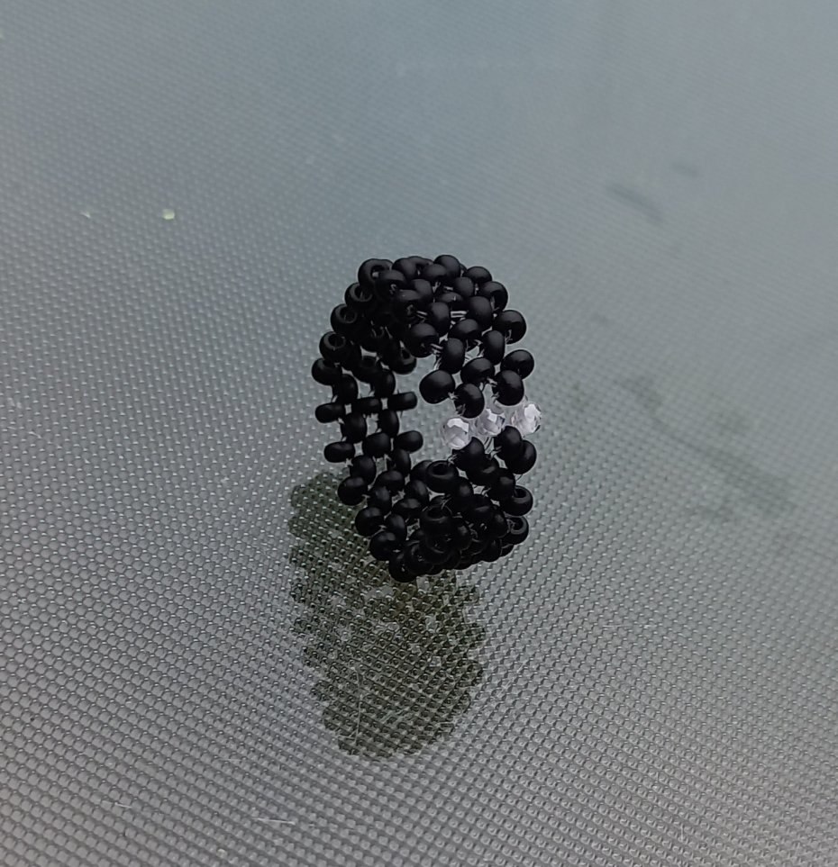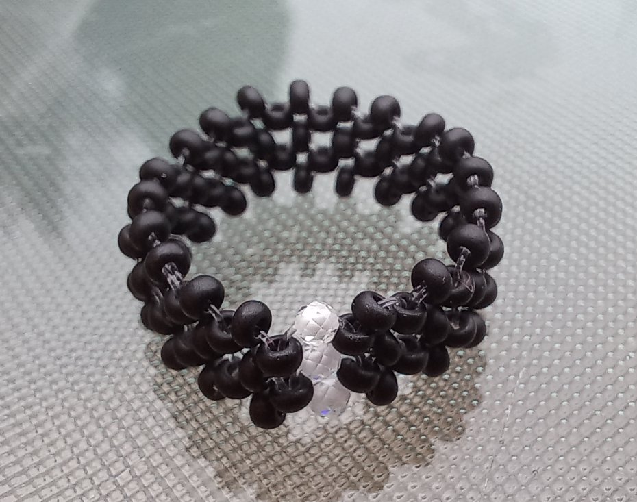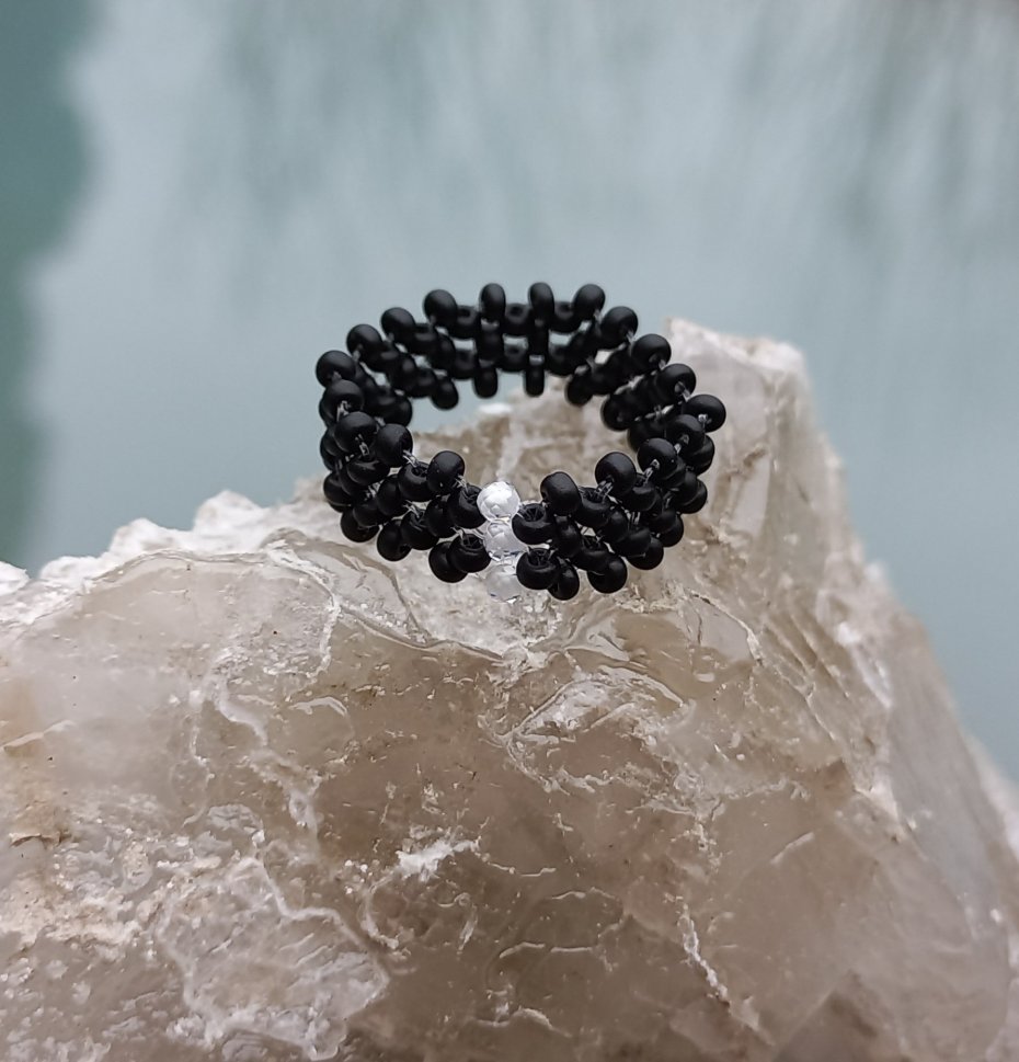 Blask cyrkonii w zestawieniu z matową czernią szklanych koralików w pierścionku wykonanym tradycyjnym masajskim splotem.