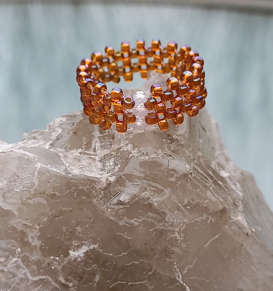 Blask cyrkonii w zestawieniu z koralikami szklanymi w kolorze bursztynu w pierścionku wykonanym tradycyjnym masajskim splotem.