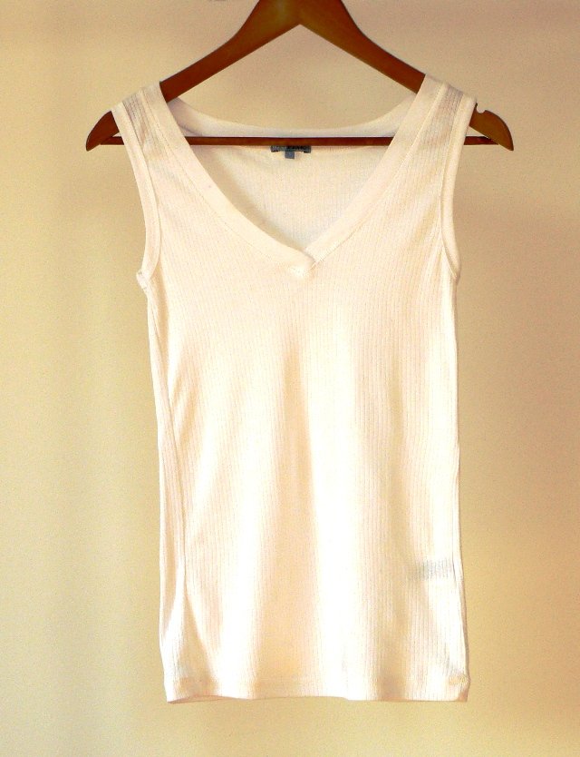 Biały top z prążkowanego materiału.