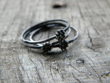 3 niezależne od siebie pierscionki z oksydowanego srebra.kwiatuszki ok 4 -5 mm.obraczki o szerokosci ok 1mm. dostępne są wszystkie rozmiary. po zakupie proszę podać rozmiar w wiadomości.