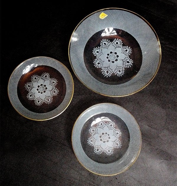 Trzy miseczki wykonane z cienkiego szkła, ozdobione motywem delikatnej koronki, złocony rant, oryginalna naklejka [Brillant Glas].