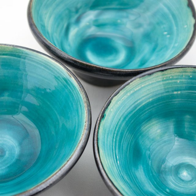 Są to trzy miski ceramiczne toczone na kole garncarskim, w kolorze srebrzysto-szarym i turkusowo błękitnym.