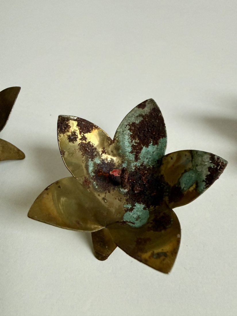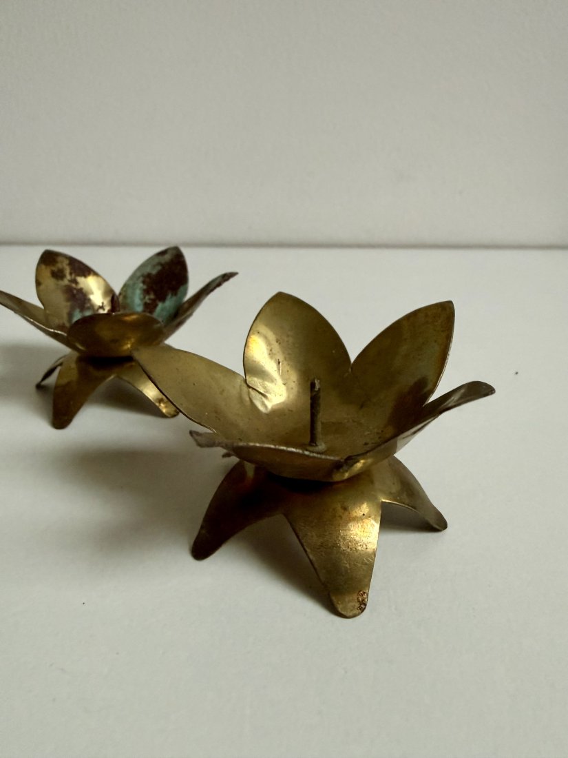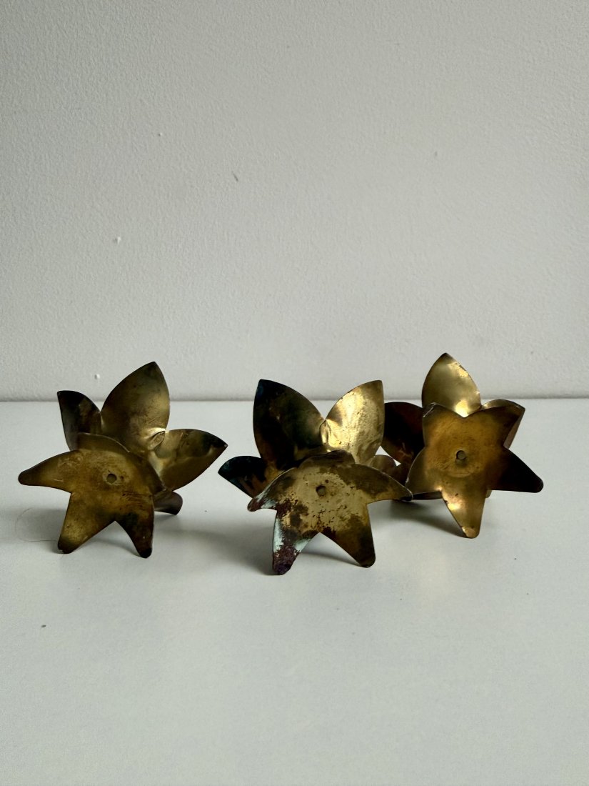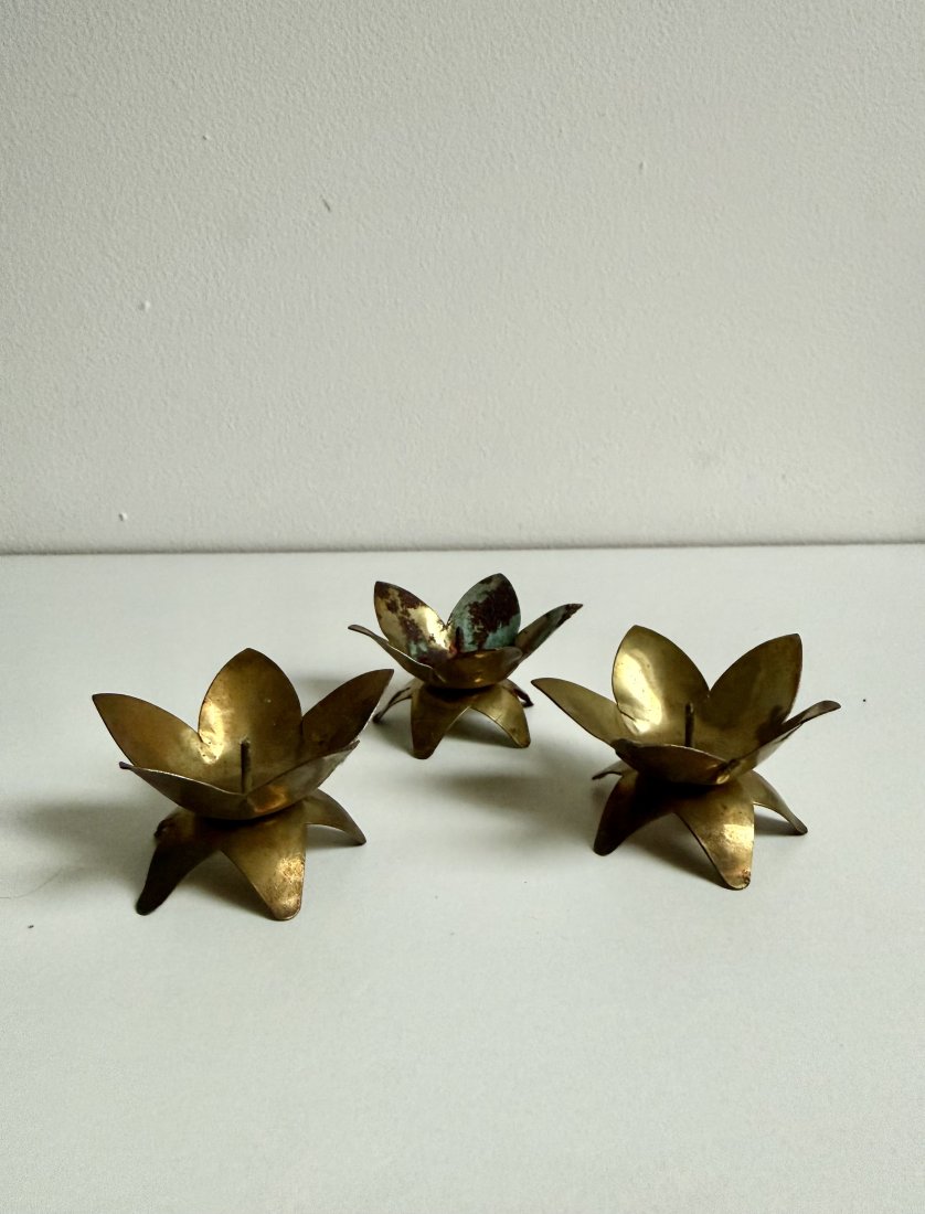 Zestaw trzech zabytkowych, małych świeczników w kształcie kwiatu lotosu, wykonanych z mosiądzu. Vintage, połowa XXw. Metal pokryty patyną. Średnica 5cm. Wysokość 2,5cm. Na małe świeczki.