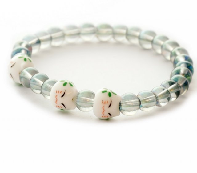 Zabawna, urocza bransoletka wykonana z kulek zielonego kryształu z tęczowym połyskiem (5mm) oraz trzech chińskich kotków szczęścia.