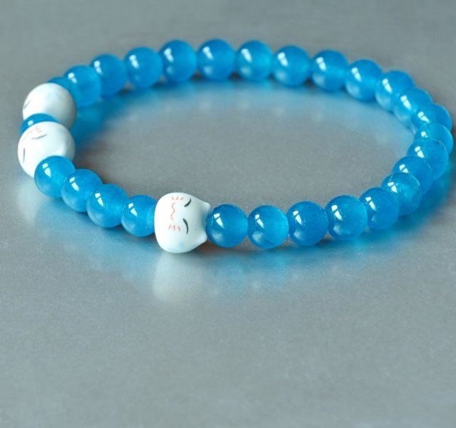 Zabawna, urocza bransoletka wykonana z kulek niebieskiego jadeitu (6mm) oraz trzech małych chińskich kotków szczęścia.