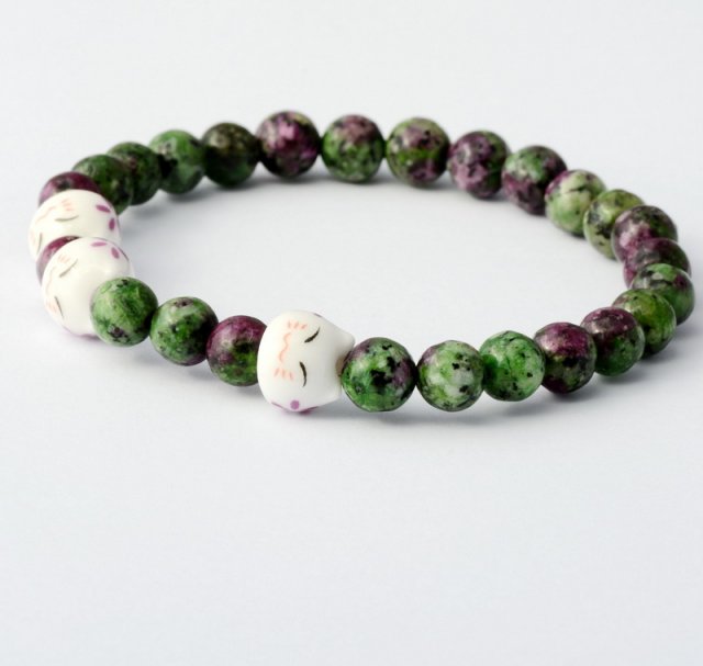 Zabawna, delikatna i urocza bransoletka wykonana z kuleczek pięknego i rzadko spotykanego minerału - zoisytu w kolorze zielono-fioletowym (5mm) oraz trzech chińskich kotków szczęścia.