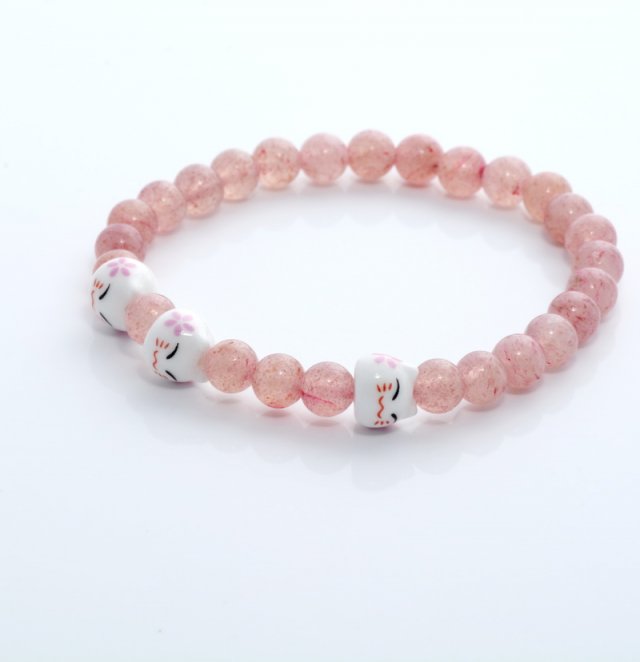 Zabawna, urocza bransoletka wykonana z kuleczek pięknego różowego kwarcu w (5mm) oraz trzech chińskich kotków szczęścia.