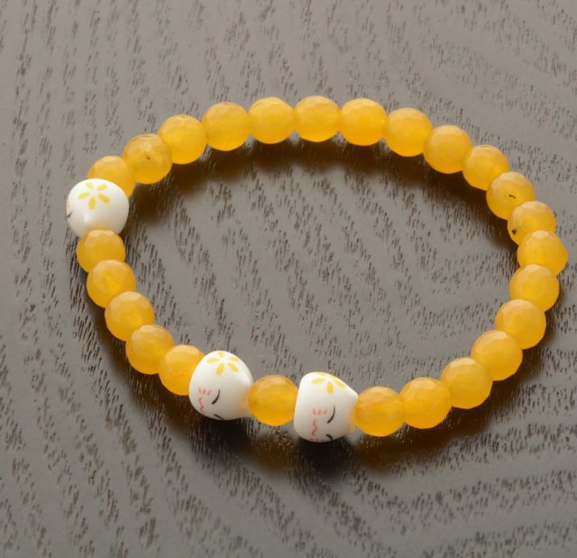 Zabawna, delikatna i urocza bransoletka wykonana z kuleczek pięknego żółtego topazu (5mm) oraz trzech chińskich kotków szczęścia.