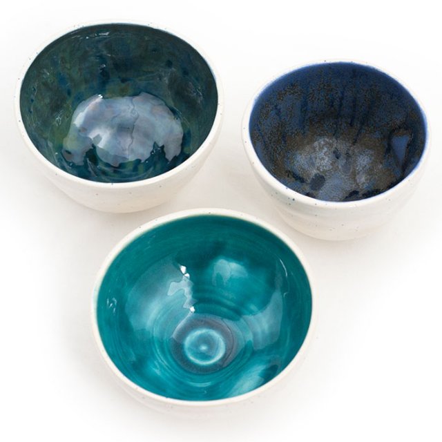 Komplet trzech ceramicznych misek, toczonych na kole garncarskim, z wklęsłościami i wybrzuszeniami.