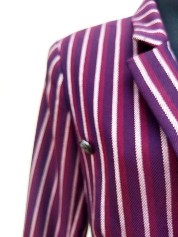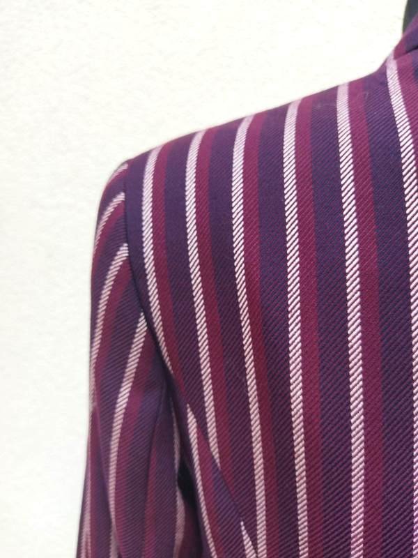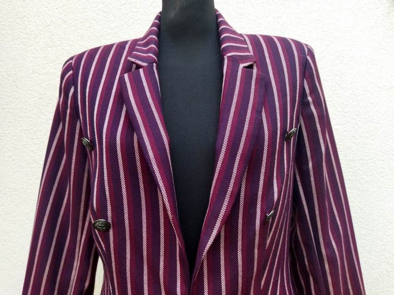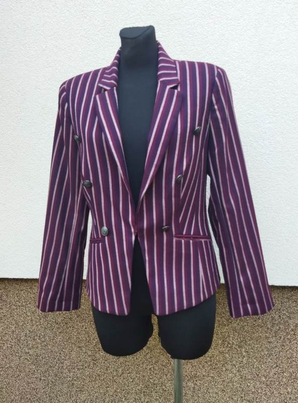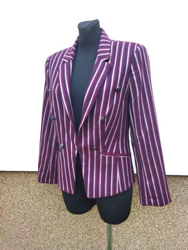 Ciekawa marynarka w paski w kolorach burgundu, fioletu i złamanej bieli. Fason otwarty z możliwością zapięcia na jedną małą haftkę, z kołnierzem z rewersami , z dwiema wpuszczanymi kieszeniami, naszywane ozdobne grawerowane guziki w kolorze starego srebra pełnia role ozdobną. Całość na podszewce.