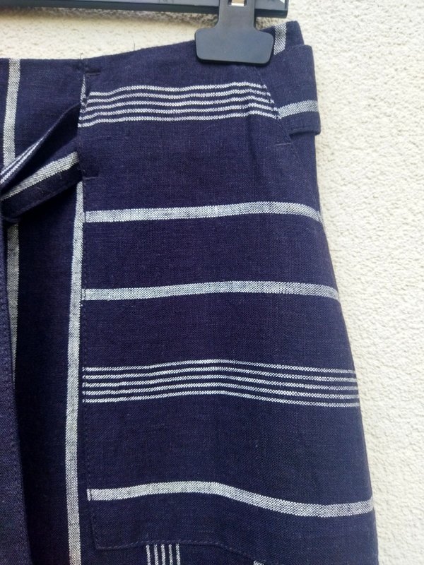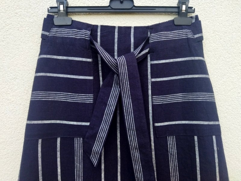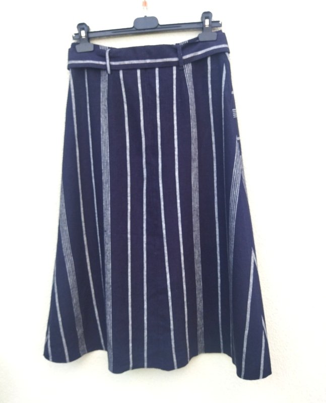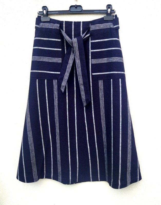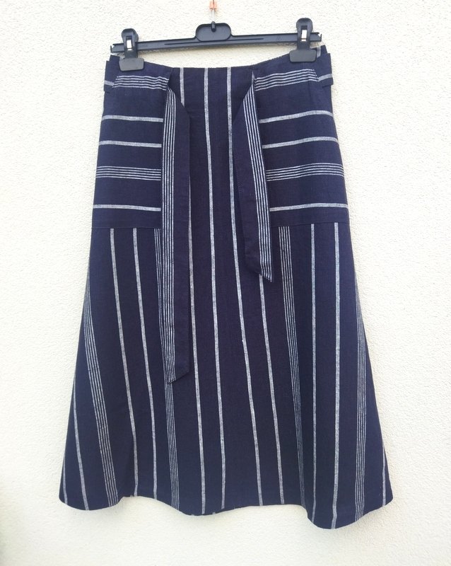 Trapezowa spódnica z lnianej tkaniny z wiskozą , w czarnym kolorze w jasne prążki w kolorze złamanej bieli( na zdjęciu wyszła granatowa). Z dwiema wpuszczanymi kieszeniami , z wiązanym paskiem przeciąganym przez szlufki. zapinana z tyłu na zamek. bez podszewki