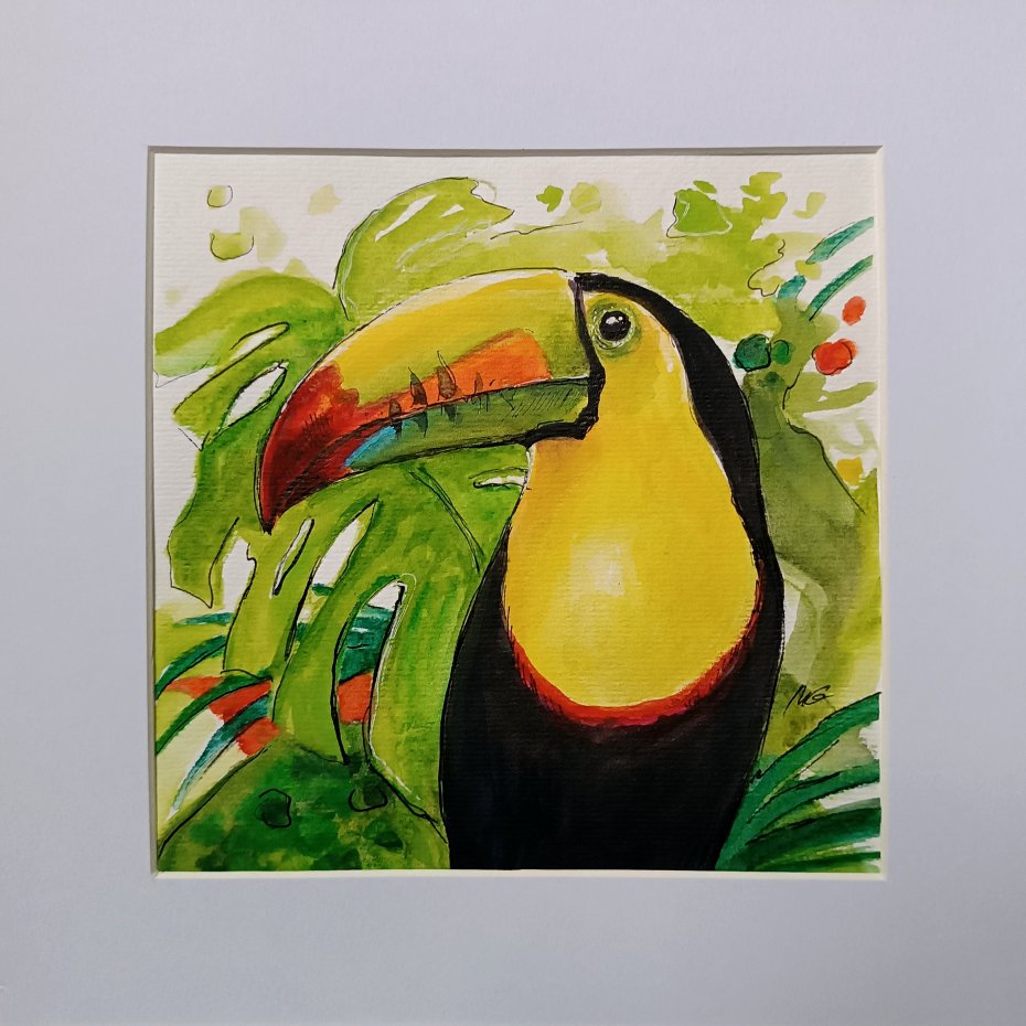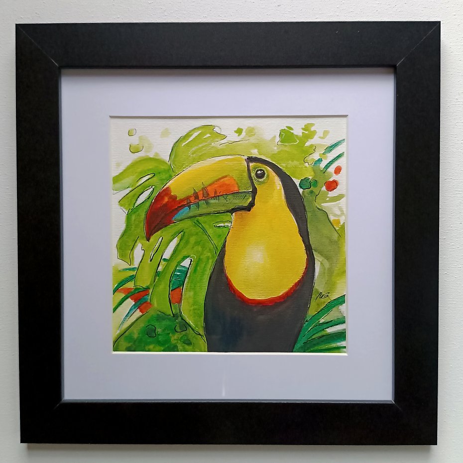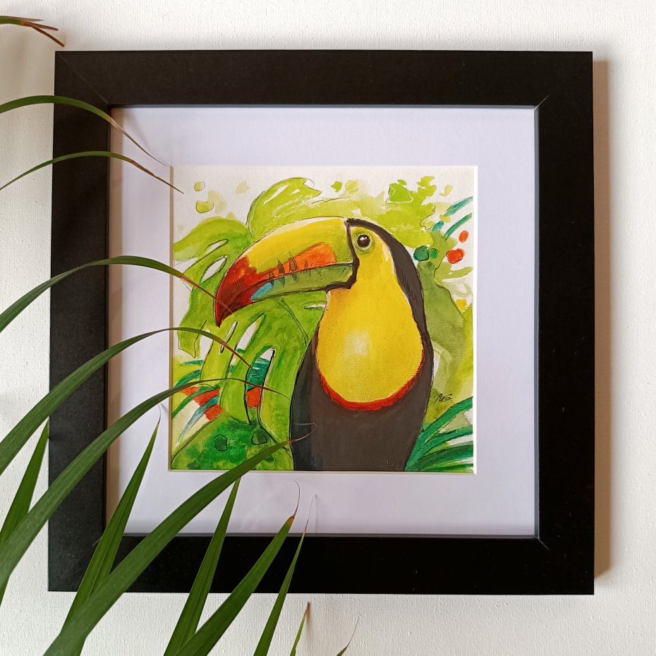 Odrobina tropików tej zimy :-) Oryginalna unikatowa akwarela. Namalowana na papierze 250g, akwarelami, tuszami Derwent, z użyciem cienkopisów. Akwarela oprawiona jest w ramę z MDF w kolorze czarnym, w passe-partou za szkłem. Obrazek przeznaczony jest do powieszenia. Wymiary całości 24,3cm x 24,3 cm, okienko passe-partou 13,7cm x13,7cm. Jedyny taki egzemplarz. Sygnowany inicjałami, z tyłu podpis. Gotowy prezent! Mam nadzieję,że wniesie odrobinę koloru do Państwa domów. Zapraszam!