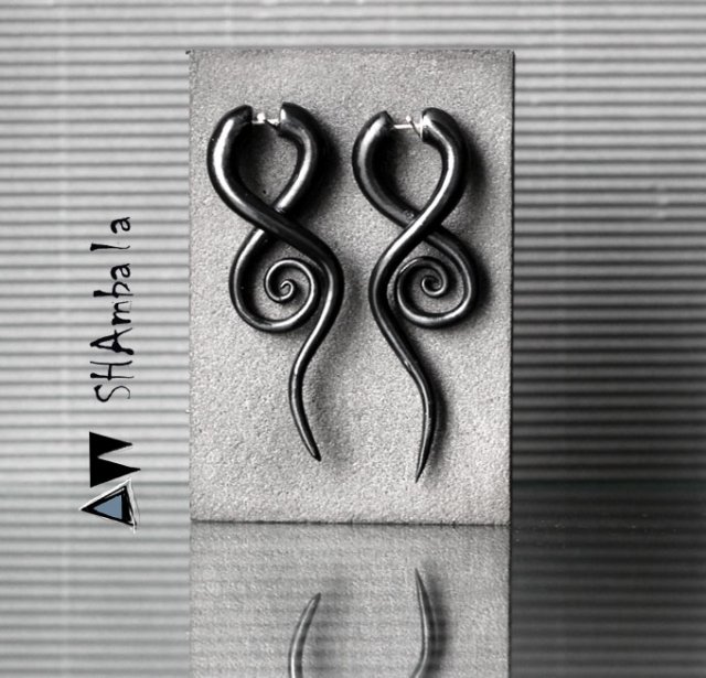 Intrygujące, etniczne kolczyki wykonane z tworzywa sztucznego i srebra. Niezwykle pomysłowe, fantazyjnie prezentują się na uchu. Głębia tkwi w ich prostocie. Gorąco polecam. Wymiary tulejek to ok. 2,5 cm na 7,5 cm.