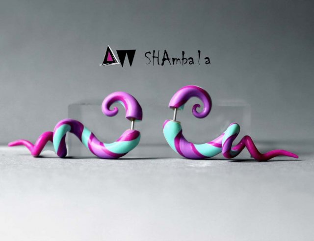 Awangardowe, trójwymiarowe kolczyki w kolorze mięty, wrzosu i fuksji. Wykonane zostały z tworzywa sztucznego i srebra. Niezwykle pomysłowe, fantazyjnie prezentują się na uchu. Głębia tkwi w ich prostocie. Gorąco polecam. Wymiary tulejek to ok. 6,5 cm na 3 cm.