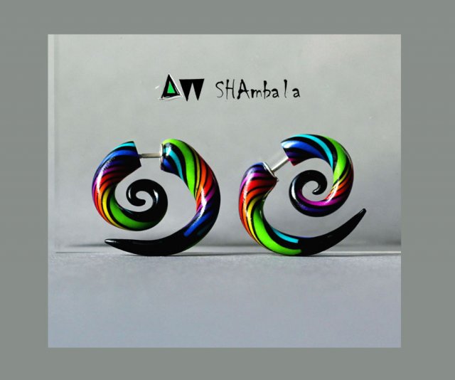 Multikolorowe, awangardowe, etniczne kolczyki. Wykonane zostały z tworzywa sztucznego. Wewnątrz znajdują się srebrne zapięcia. Ciekawe, zabawne, zaskakujące. Wymiary tulejek to ok. 2,5 cm na 2,7 cm. Polecam:)