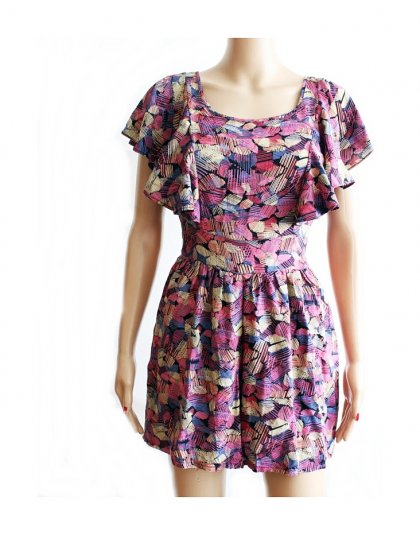 Urocza kombinezon marki AD LIB w rozmiarze 38 Oryginalny ciekawy wzór i kolorystyka. Krój dolnej części spodenek -tulipana - zaszewki ozdobne kontrafałdy z przodu i z tyłu, efektowne fale na rękawkach. Na bokach kieszenie z tyłu efektowny dekolt. Materiał 100% viskoza. Stan idealny - jak nowa