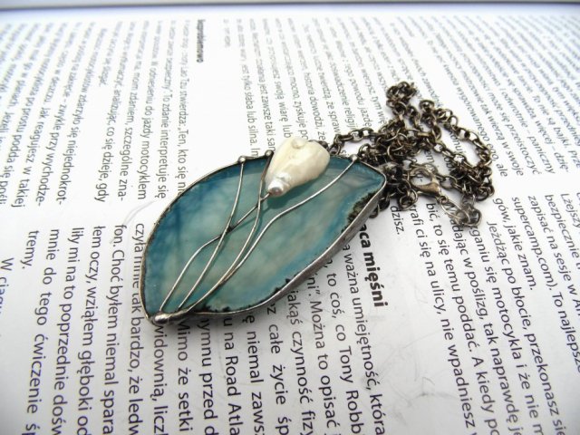 Wisiorek wykonany z miedzi, cyny, agatu i perły słodkowodnej. Wymiary ok. 6 na 3 cm. Łańcuszek o długości ok. 45 cm.