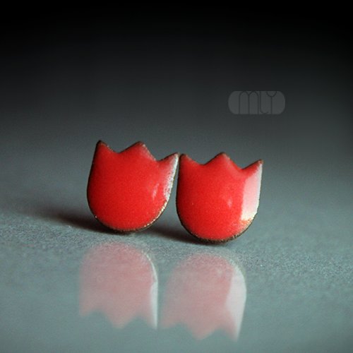 Ceramiczne kolczyki w formie sztyftów, ręcznie wykonane z delikatnej czekoladowobrązowej gliny kamionkowej, jednostronnie szkliwione mieszanką czerwonych szkliw z efektem plamek i subtelnym połyskiem, na antyalergicznych sztyftach w kolorze srebrnym. Długość ok.13mm.Polecam