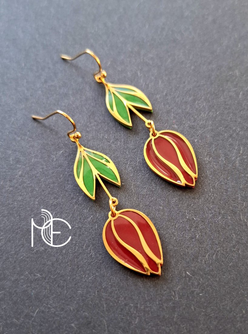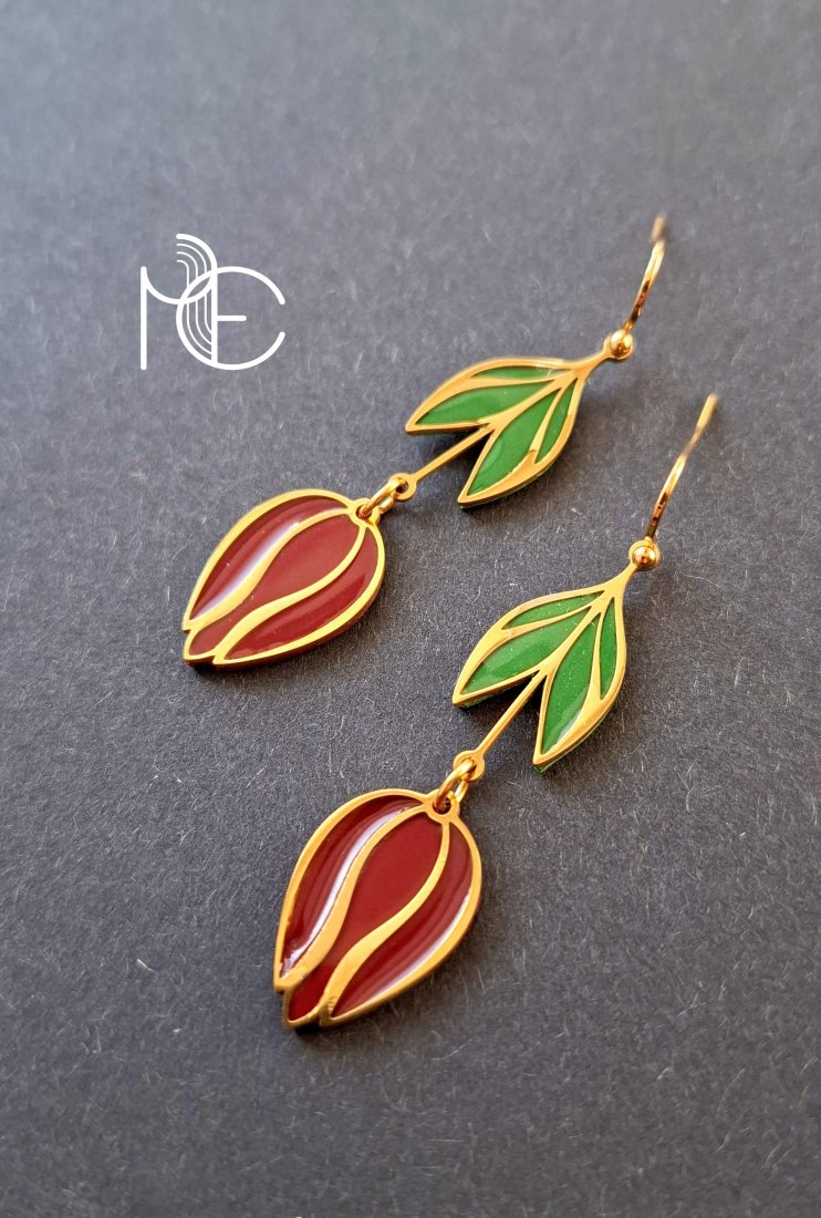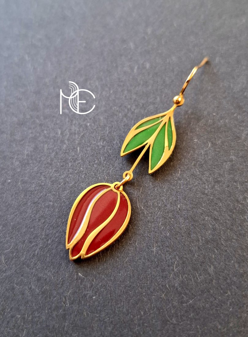 Wiosenne kolczyki wiszące wykonane z wysokiej jakości glinki polimerowej z dodatkiem ozdobnych elementów metalowych. Jednostronne, bigle proste, pozłacane i nieuczulające. Wymiary kolczyków: długość całkowita: 5,8 cm, szerokość max. 1,5 cm. Wykonane w jedynym egzemplarzu.