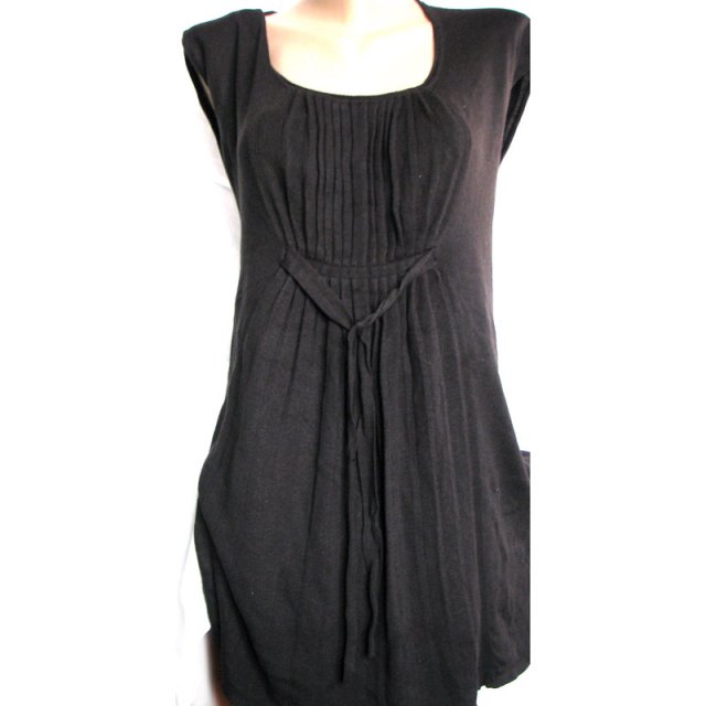 Tunika prosta w kroju o linii A z ozdobnym marszczeniem na biuście oraz wiązaniem. Dekolt okrągły. Wymiary na płasko: biust 50 cm, talia 50cm, biodra 75 cm. Długość mierzona przodem od ramienia 80 cm.