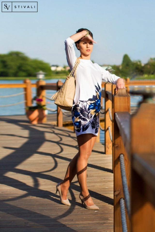 Tunika uszyta z białej bawełny z motywem kwiatowym na dole.