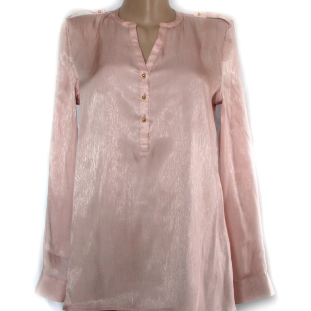 Niezwykle ciekawa tunika o kroju A firmy H&M, kolor blady łososiowy różowy, na stójce, zapinana z przodu na złote guziczki kuleczki. Rękaw prosty z mankietem.