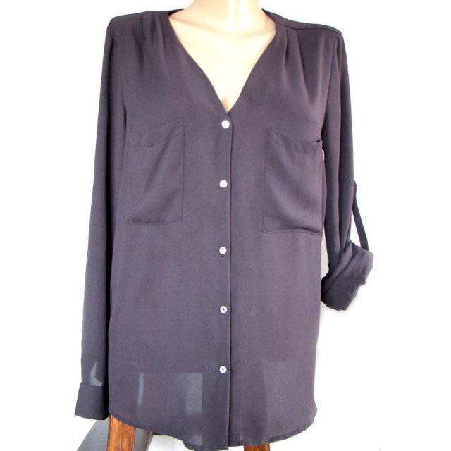 Ciekawa tunika o prostym kroju firmy H&M, zapinana z przodu na guziczki z masy perłowej, dekolt w szpic. Rękaw prosty z mankietami, z możliwością dodatkowego skrócenia paseczkiem na guziczek. Z przodu naszywane kieszenie.
