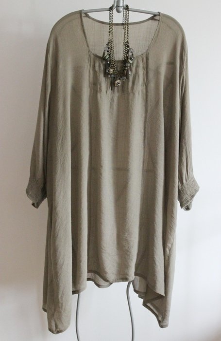Tunika w kolorze khaki. Rozmiar XXXL. Wymiary: obwód biustu-85cmx2, obwód bioder-96cmx2, długość rękawa-48cm, długość tuniki-91cm.