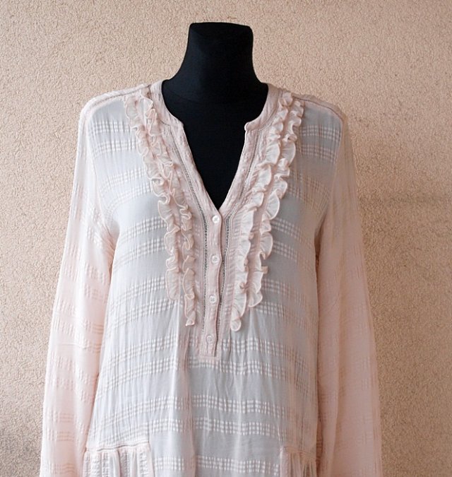 Piękna Tunika marki Lindex, w delikatnym beżu z domieszką różu. Materiał 100% wiskoza. Śliczne wykończenie falbanką i mereżką. . Stan bardzo dobry. Rozmiar z metki 44, ale chyba bardziej na wyższą 42, (długi rękaw). Na manekinie o rozmiarze 38.