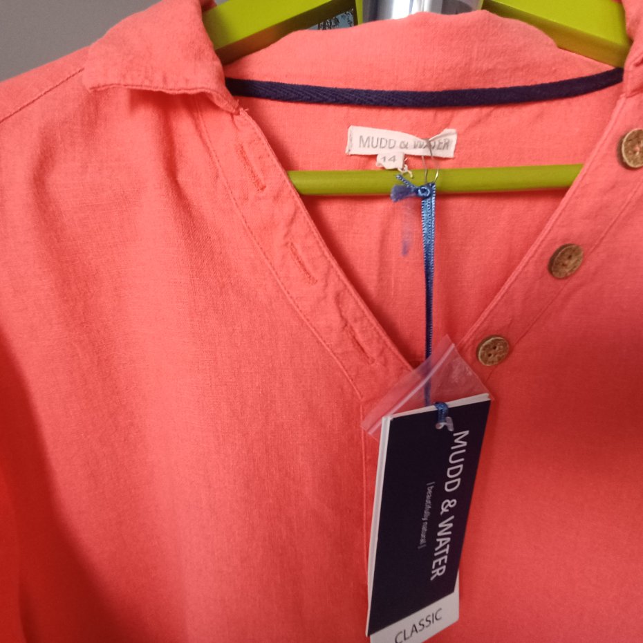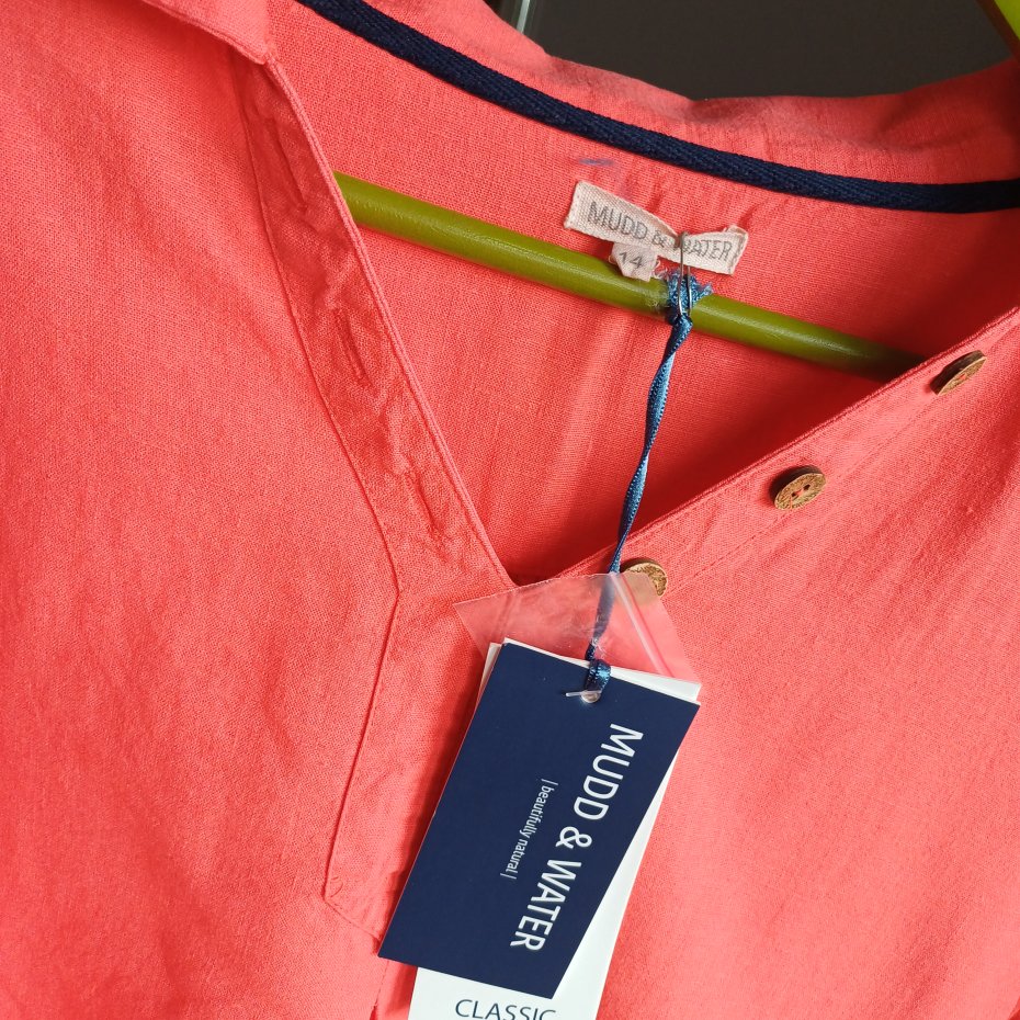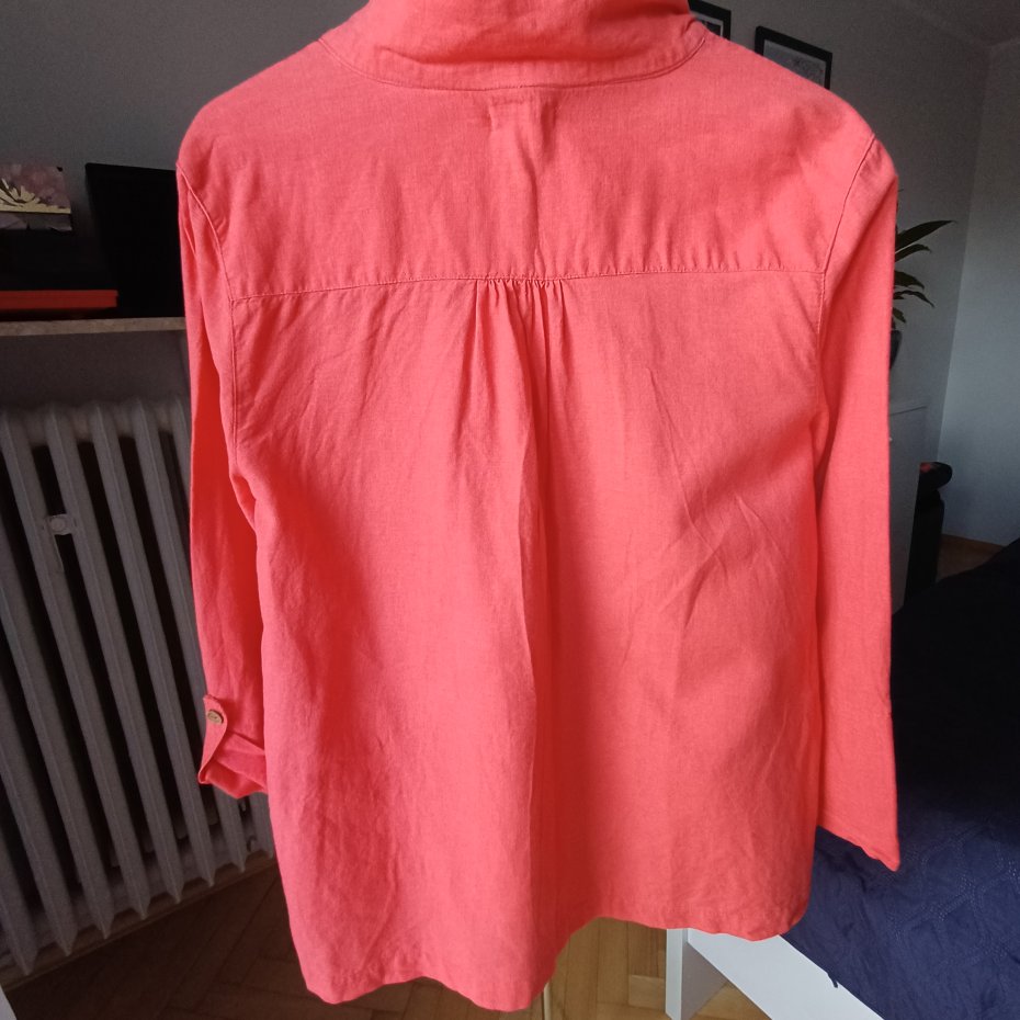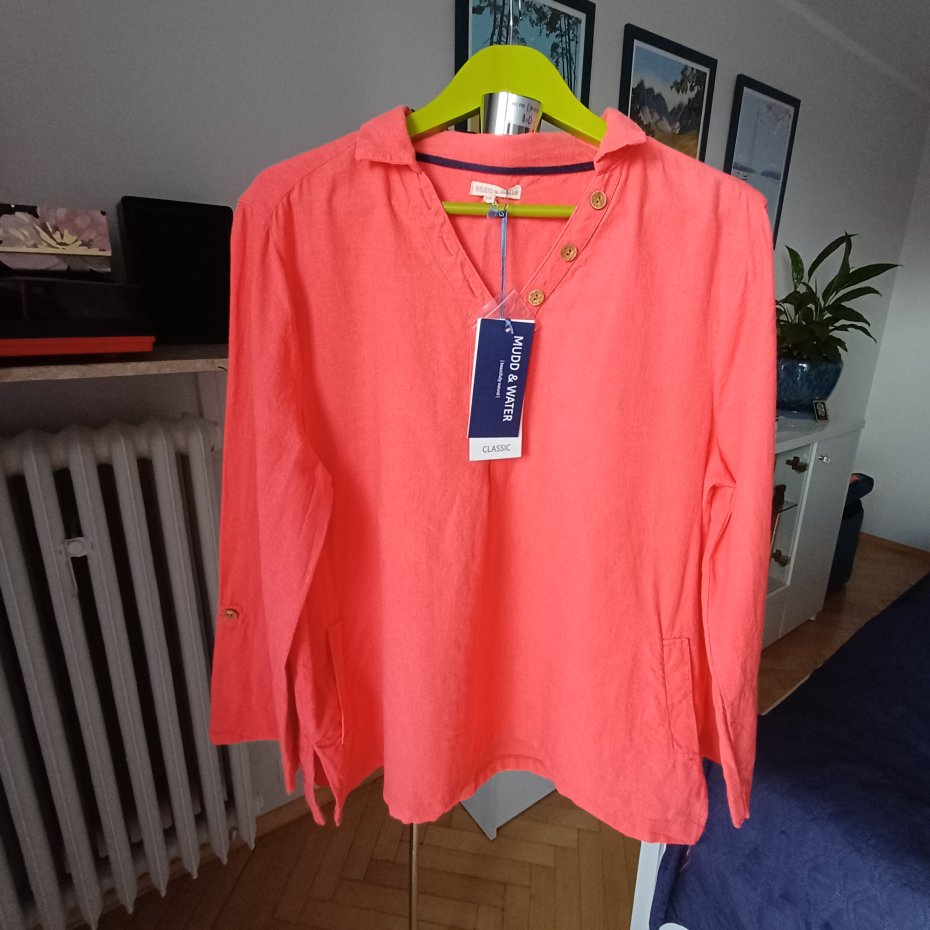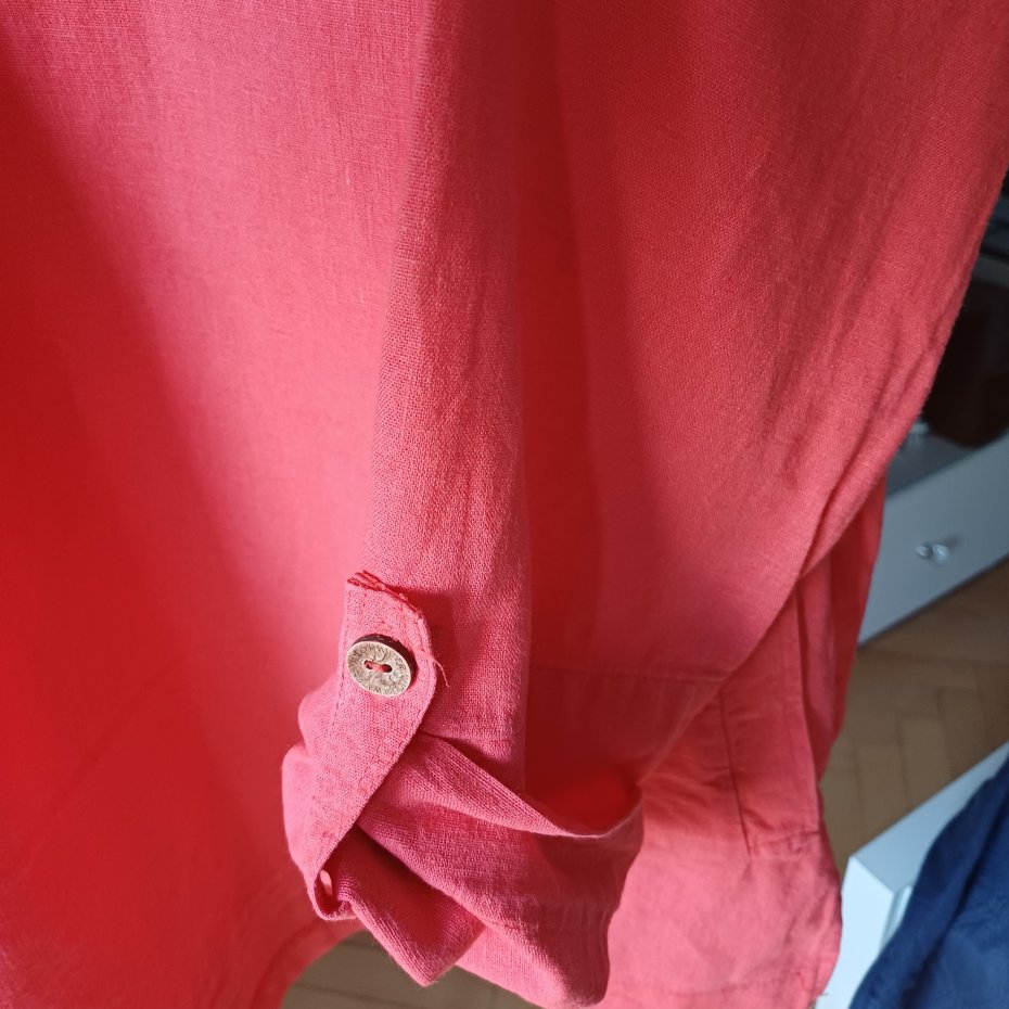 Nowa tunika w kolorze jasnym koralowym. Len z bawełną. Krój trapezowy,rękawy do podwinięcia,kieszenie I rozcięcia w bocznych szwach. Długość: 68 cm, szerokość w ramionach: 44 cm, obwód klatki piersiowej: 59 cm, dół: 69 cm, obwód bioder: 65 cm.