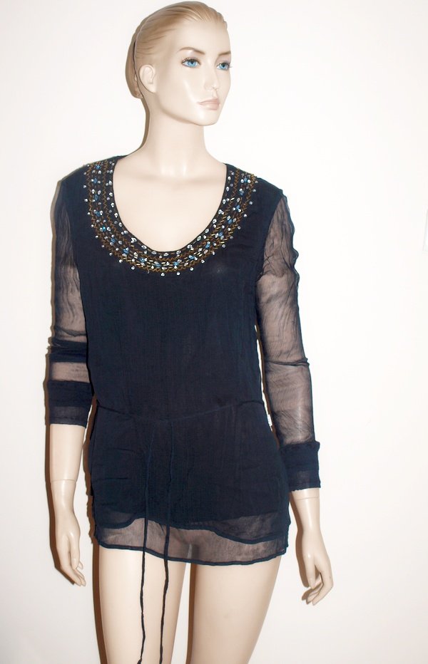 Dwuwarstwowa tunika marki Simply. Zewnętrzna warstwa z transparentnej wiskozy, pod spodem z cieniutkiej bawełny, rękawy elastyczne, prześwitujące. Dekolt ozdobiony koralikami. Tunika , ma trochę zaciągnięć (głównie na rękawach), które wynikają raczej ze sposobu przechowywania, transportu itp. Po włożeniu nie są specjalnie widoczne, ponieważ rękaw jest elastyczny i naciąga się. Sznureczek moim zdaniem zupełnie niepotrzebny. Rozmiar z metki 42-44. Prezentowana na manekinie o rozmiarze 38. Podaję wymiary mierzone na płasko;