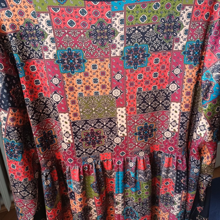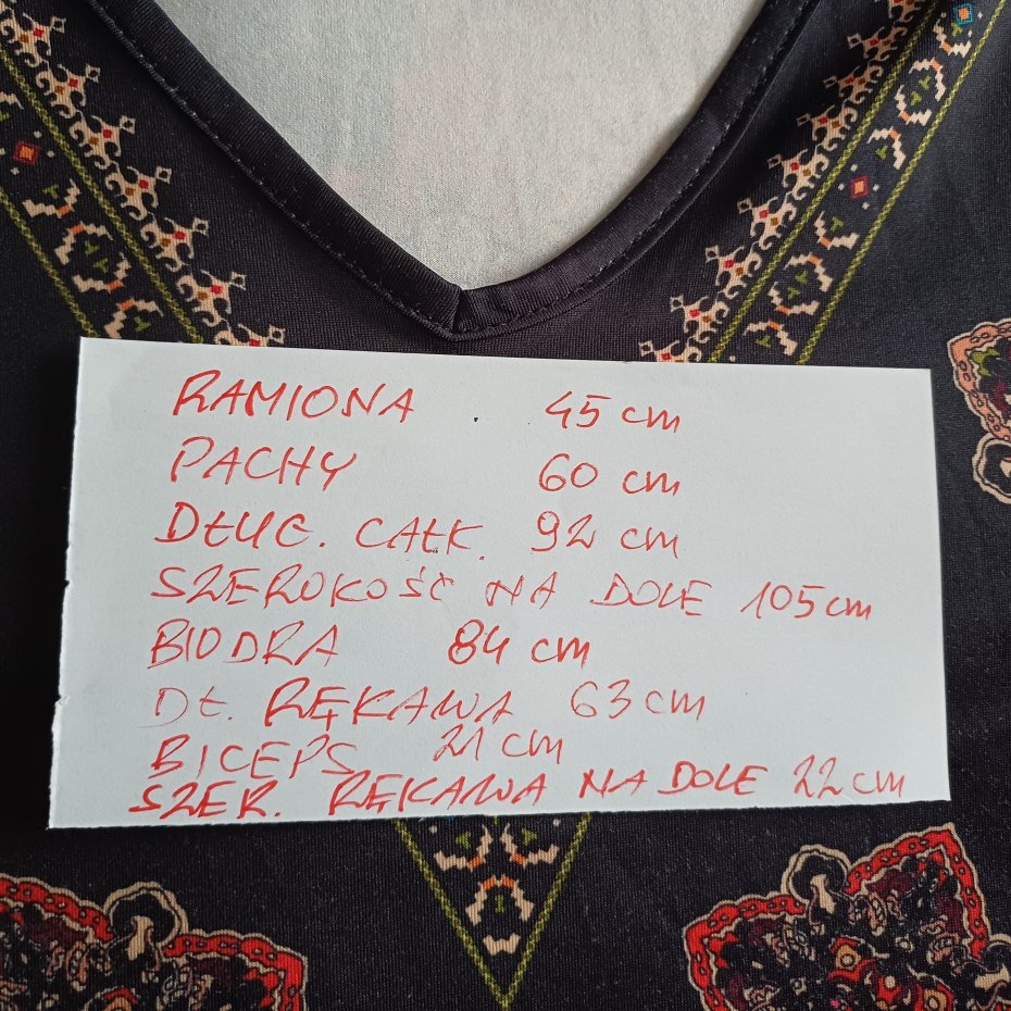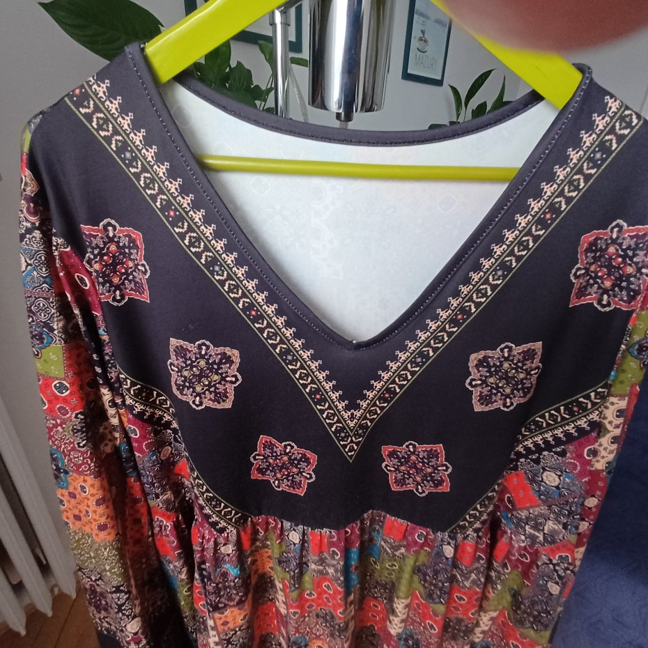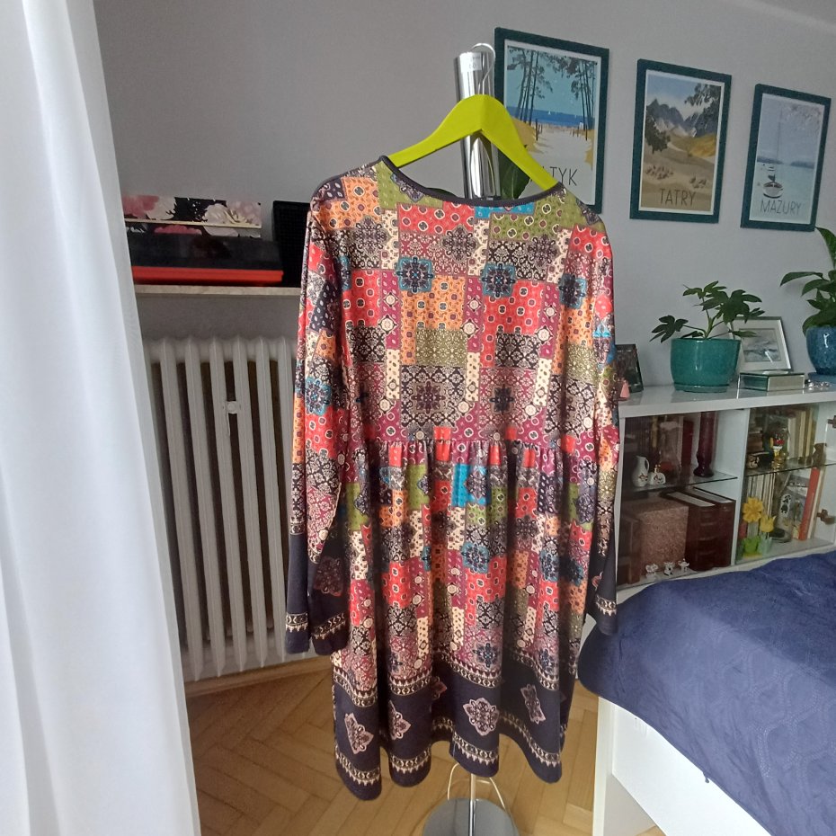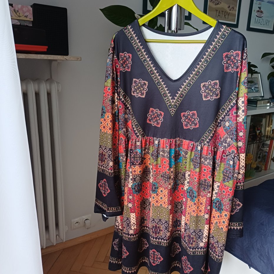 Tunika lub krótka sukienka. Ciekawy,kolorowy wzór,swobodny fason. Materiał lejący,rozciągliwy,niegniotący. Wymiary na zdjęciu.