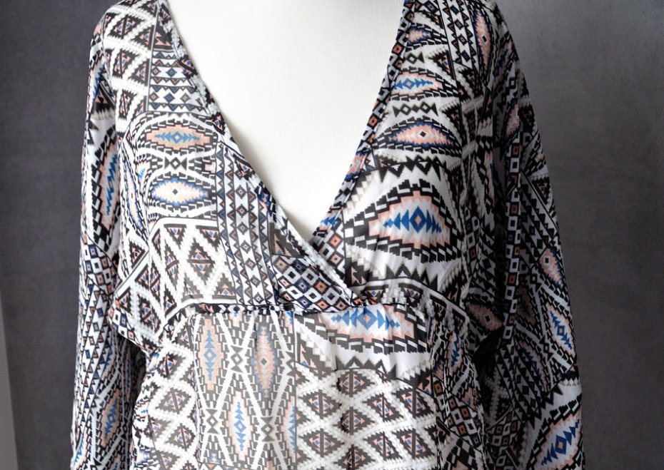 Tunika uszyta z nieco prześwitującego, miękkiego szyfonu w etniczny wzór. Projekt polskiej marki GREY WOLF.