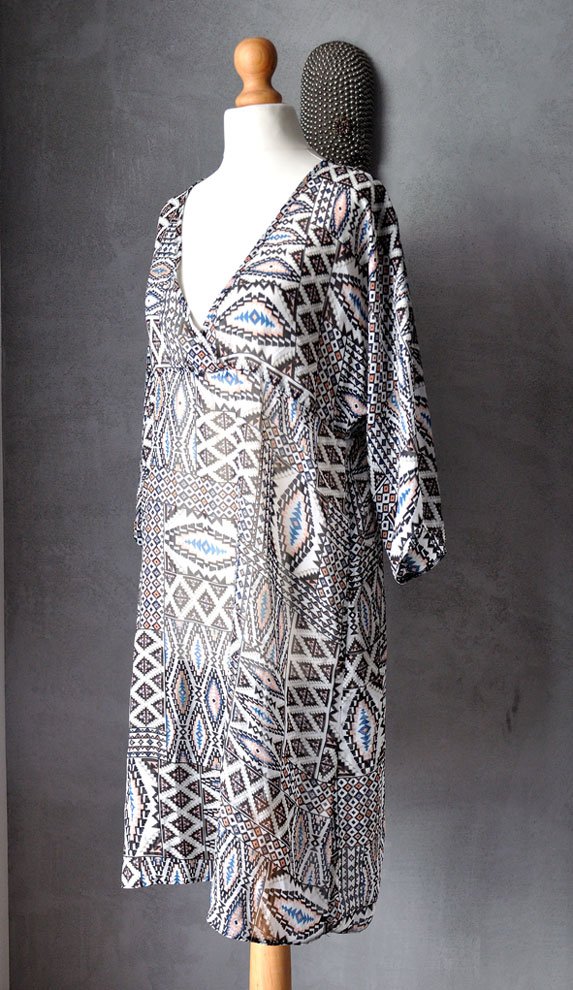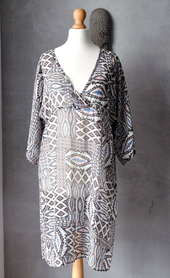 Odcięta pod biustem (szew pod biustem jest elastyczny), z kopertowym dekoltem i szerokimi, kimonowymi rękawami.