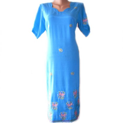 Niezwykle ozdobna i ciekawa tunika o prostym kroju z połyskującej, kreszowanej tkaniny, ozdobiona haftami i cekinami. ozdobny dekolt Po bokach pęknięcia wysokości 50 cm. Wymiary: biust 51 cm, talia 47 cm, długość tuniki mierzona tyłem od ramienia do dołu 104 cm, długość rękawa mierzona po wewnętrznej stronie 15 cm.