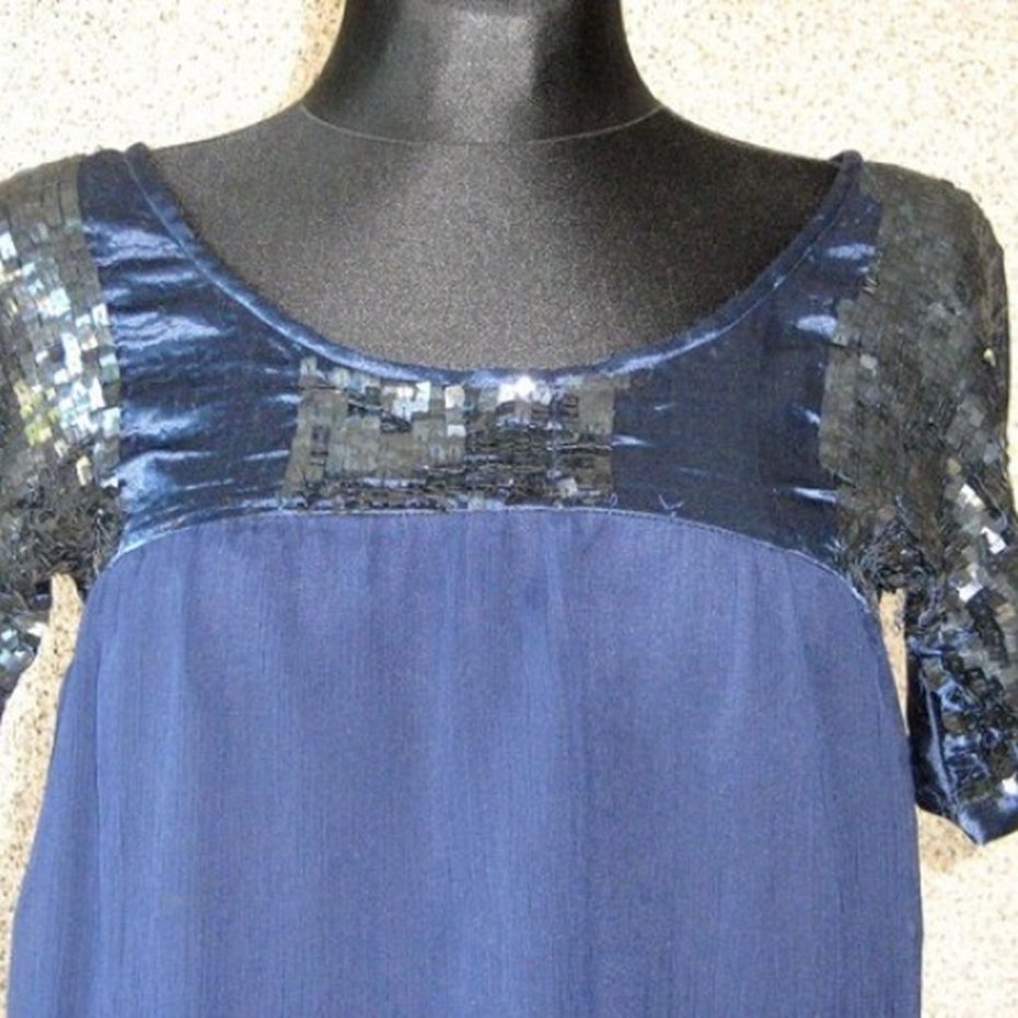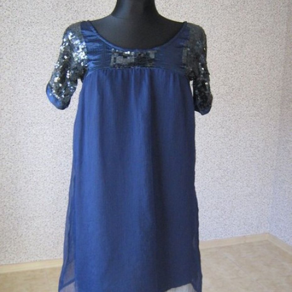 Z przodu karczek i rękawy z kwadratowych cekinów.
