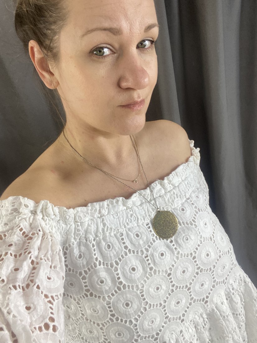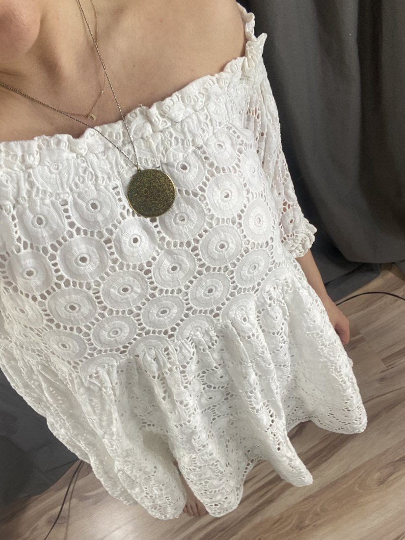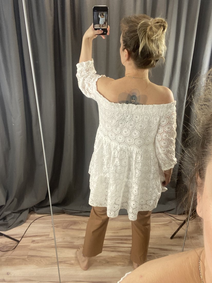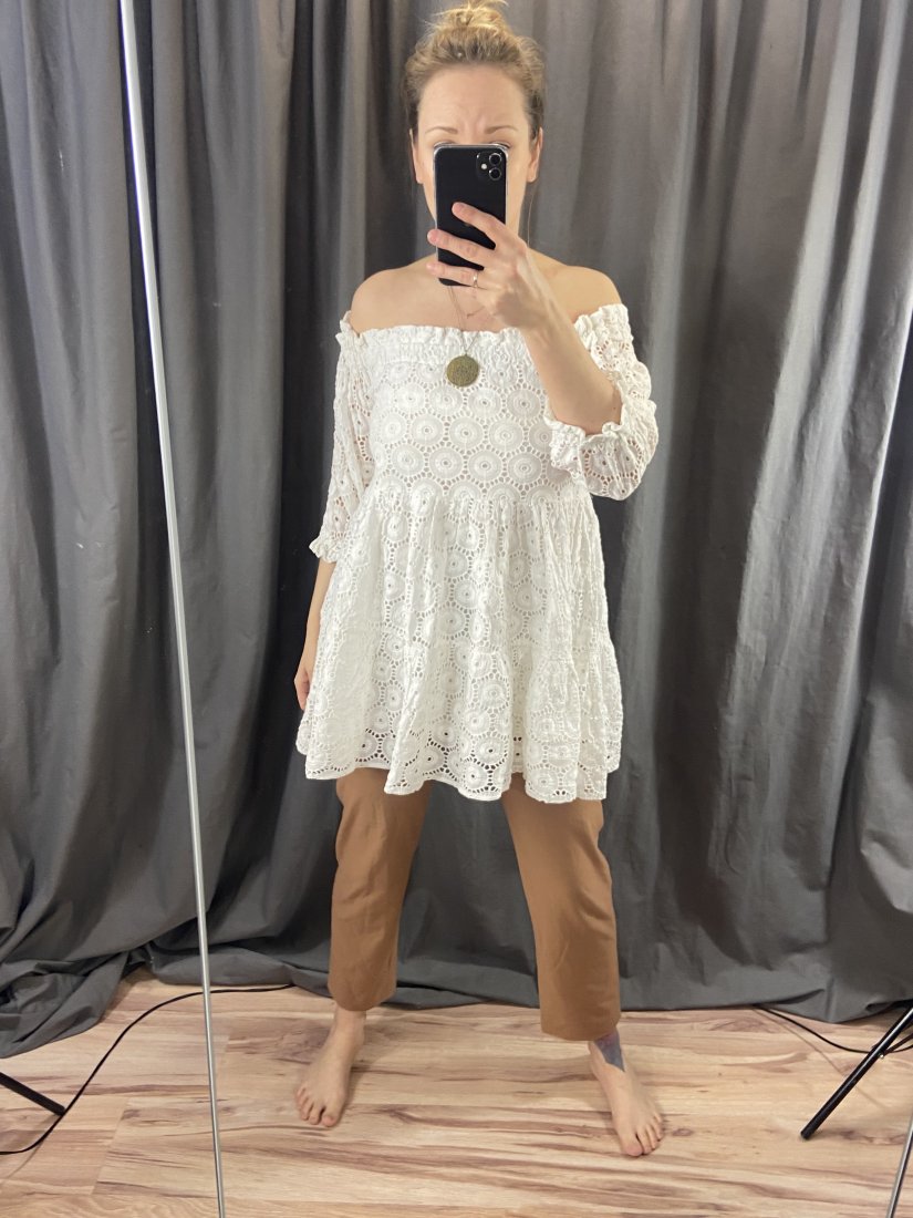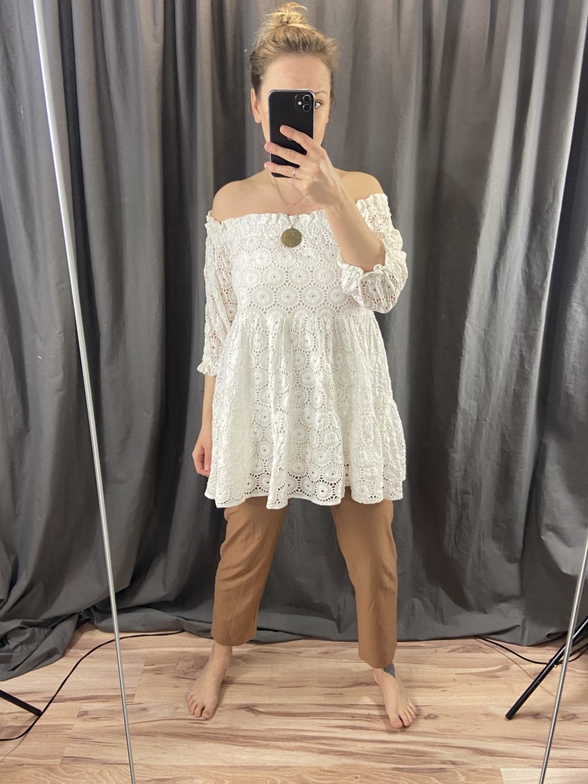 Bawełniana dwuwarstwowa tunika z gumą w dekolcie (można nosić dekolt okrągły lub na ramiona). Wierzchnia warstwa pokryta haftem angielskim.